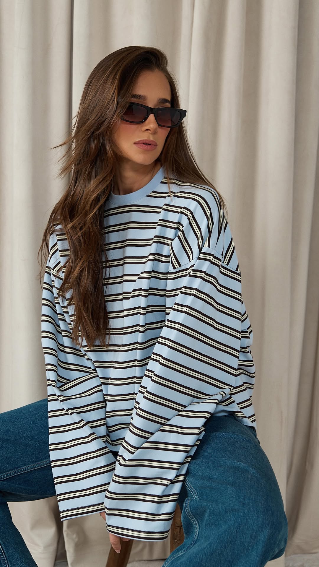 The long sleeve top is a knit polo style with a three-button placket and a contrasting white collar. It features horizontal stripes in navy and white against a green background, with a relaxed, oversized fit.