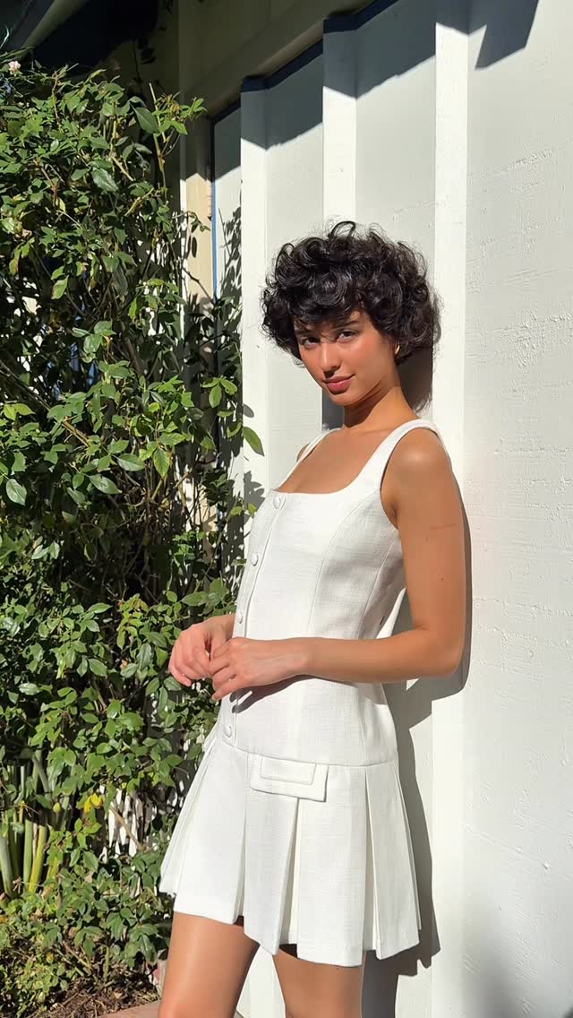 This white romper features a square neckline and is constructed from a woven fabric. The bodice is detailed with decorative gold buttons and a peplum waist, while the lower portion is a fitted mini skirt.