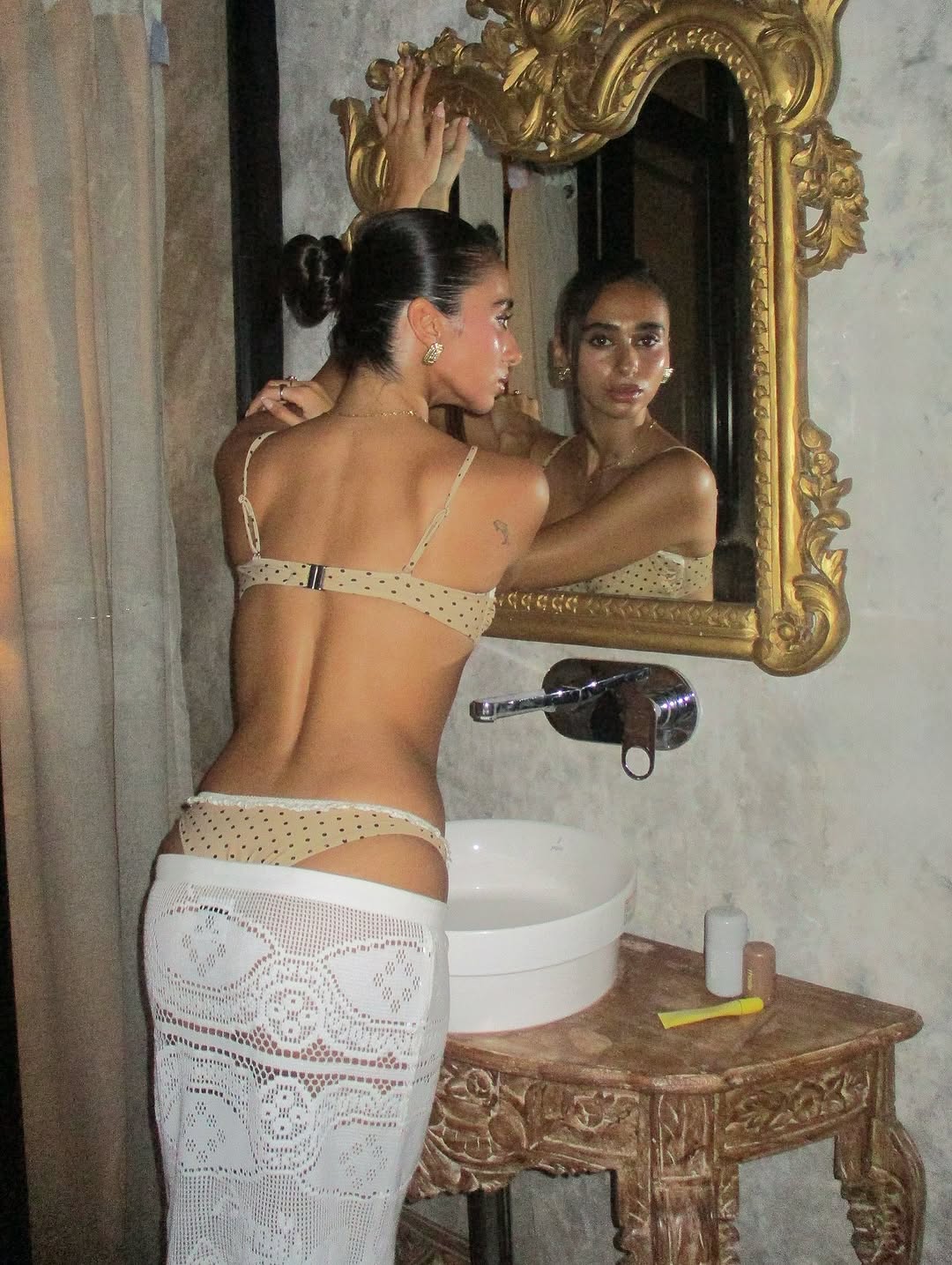 The top is a white, sleeveless, cropped style made from a delicate, open-weave lace fabric. It features a straight neckline and a slightly ruffled hem.