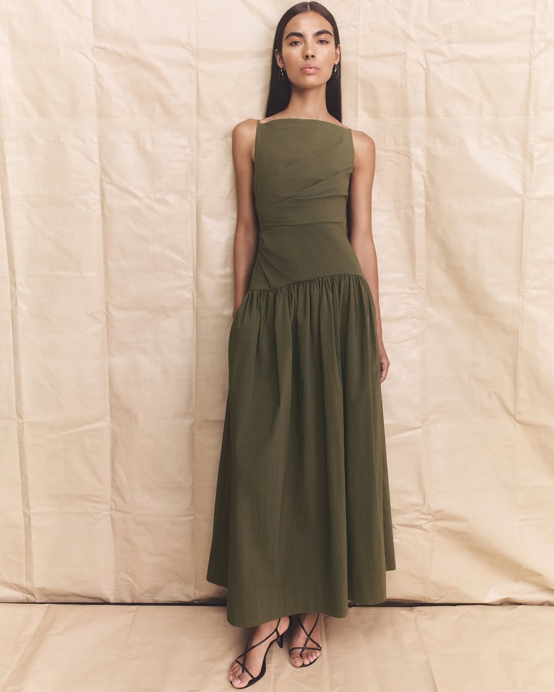 This maxi dress is crafted from a solid-colored woven fabric. It features a strapless bodice with a gathered waist and a flowing skirt.