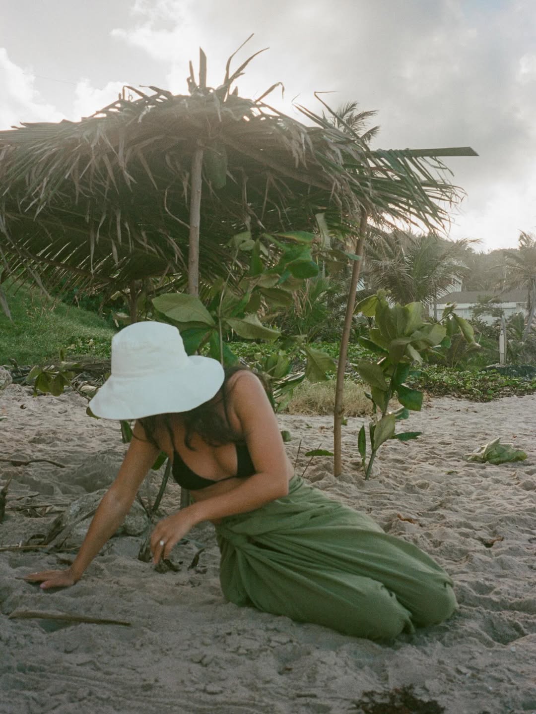 The bestselling Panda Hat is an oversized bucket hat crafted from 100% cotton, featuring a wide brim for ample sun protection. Its packable design makes it an easy and chic accessory for resort wear or sunny days. Made in Indonesia, this hat combines style with practicality.