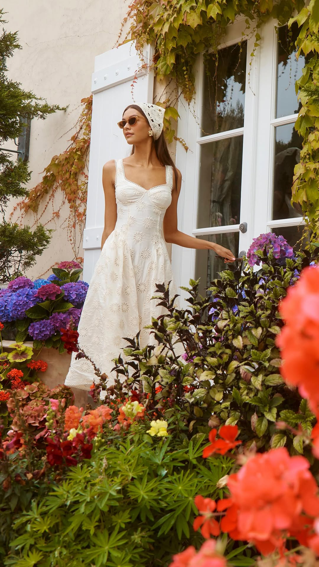 This midi dress is crafted from eyelet cotton fabric. It features a bustier-style bodice, a tiered skirt, and adjustable straps.