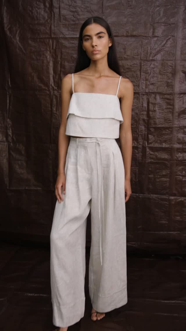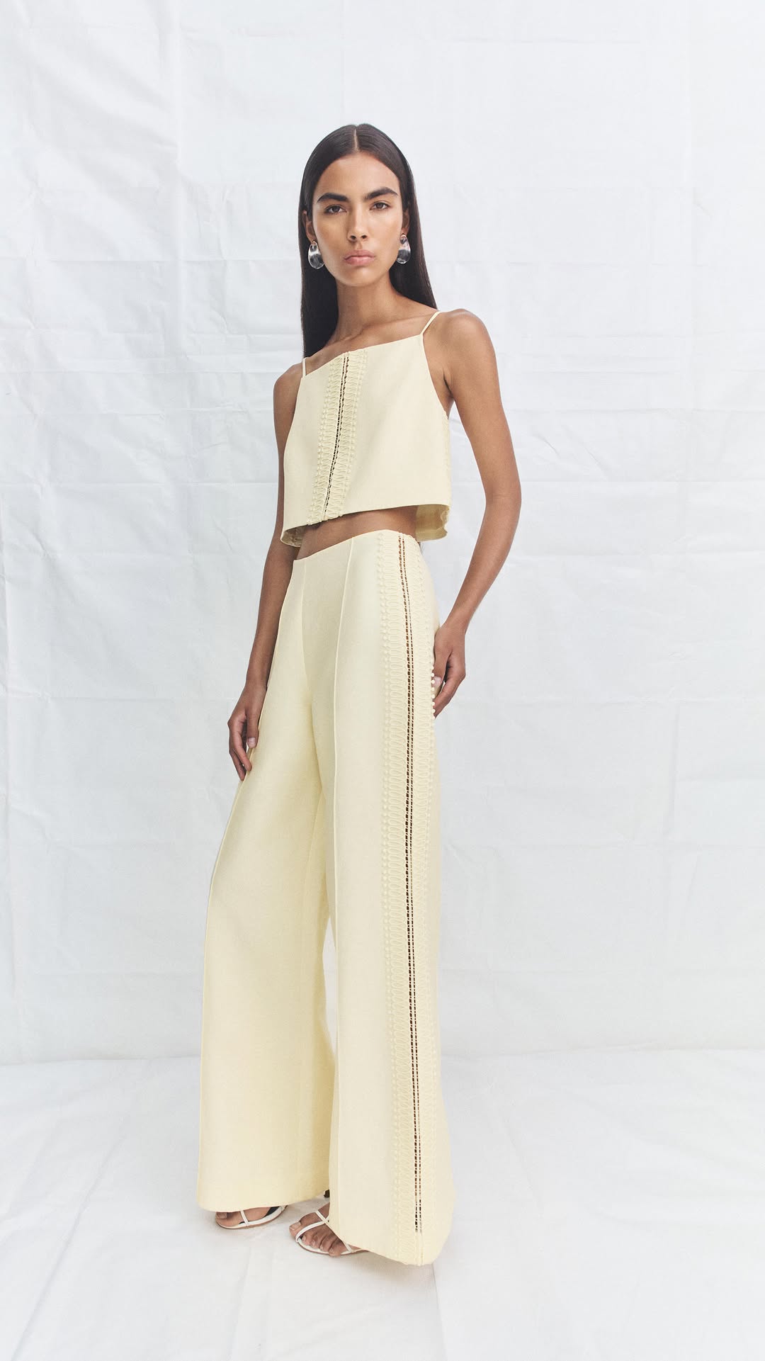 This camisole is crafted from a woven fabric. It features a cropped silhouette with a button-front closure and thin straps.