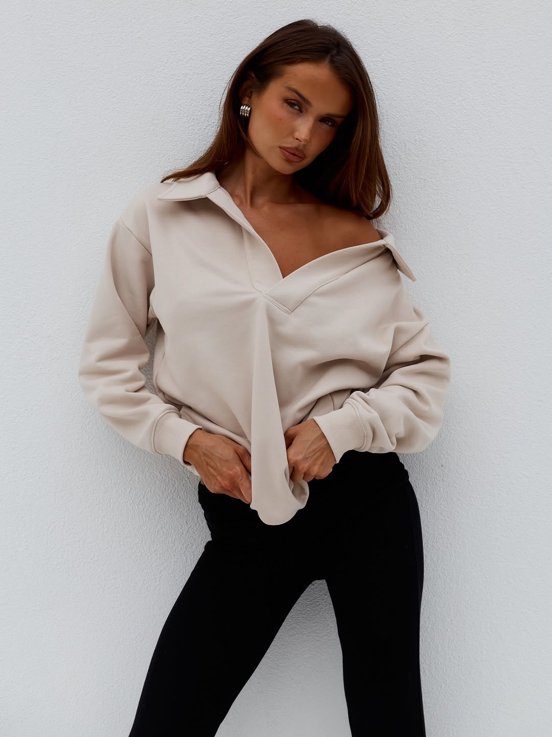 Long sleeve top in a stretch woven fabric with a tailored silhouette. Features a deep V-neckline with hook-and-eye closures down the center front and faux flap pockets at the hip.