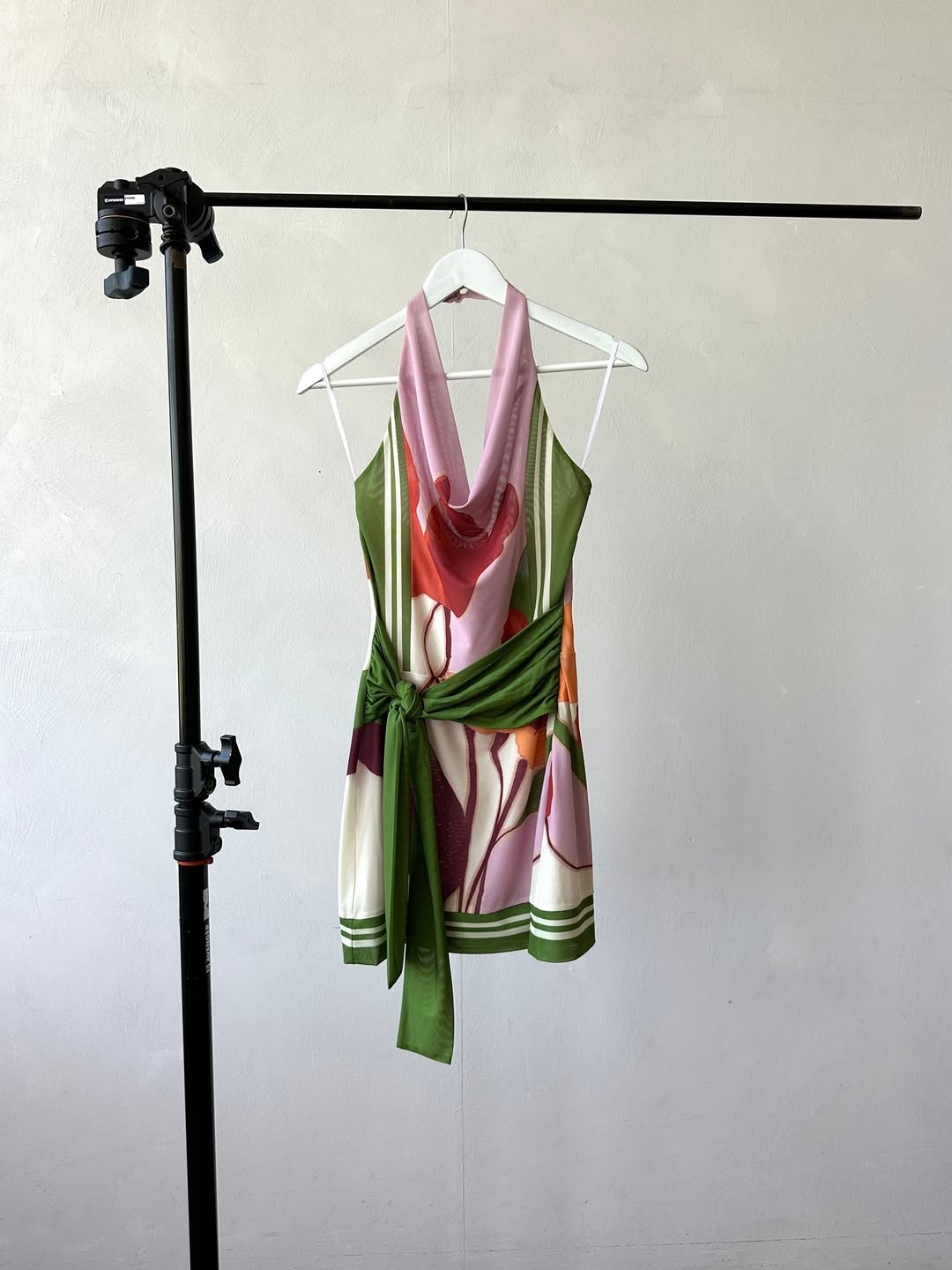 This mini dress features a halter neckline and a wrap-style front. It is constructed from a woven fabric and includes a self-belt with a decorative buckle at the waist.