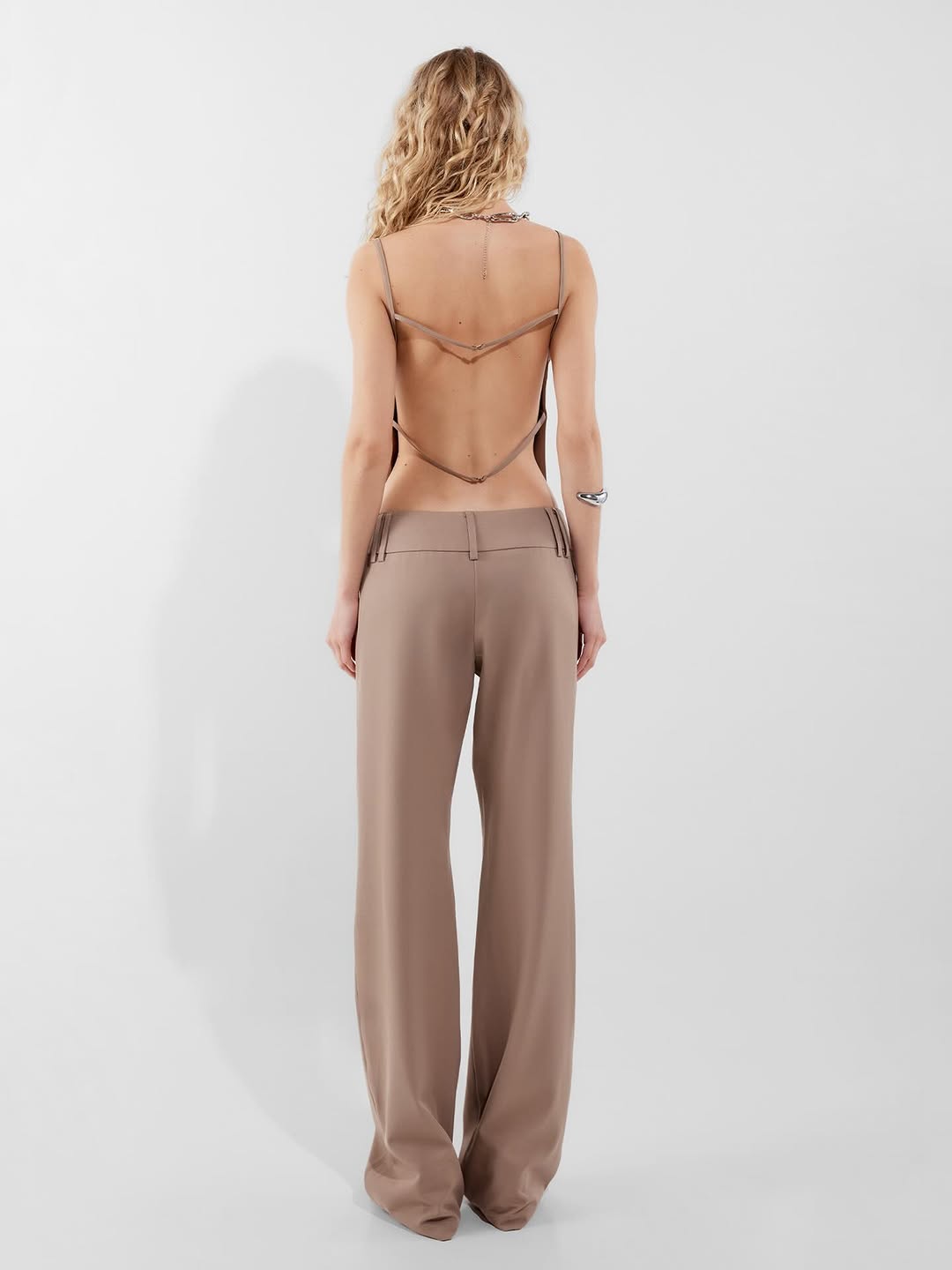 beige spaghetti strap crop top with high halter neckline, backless design, cropped to expose midriff