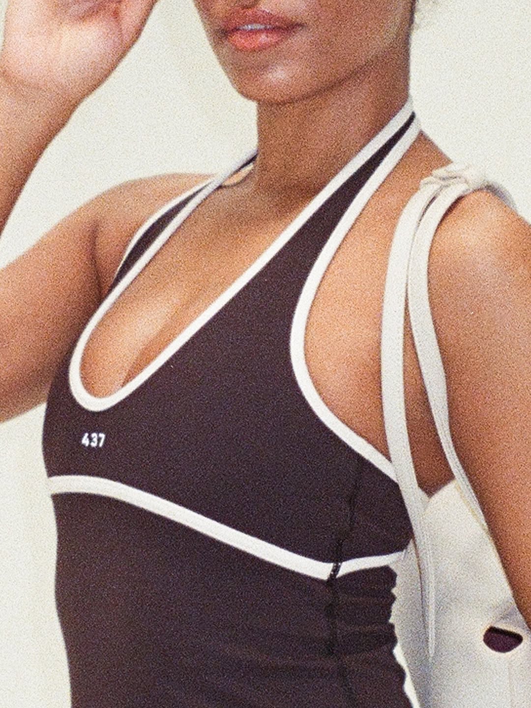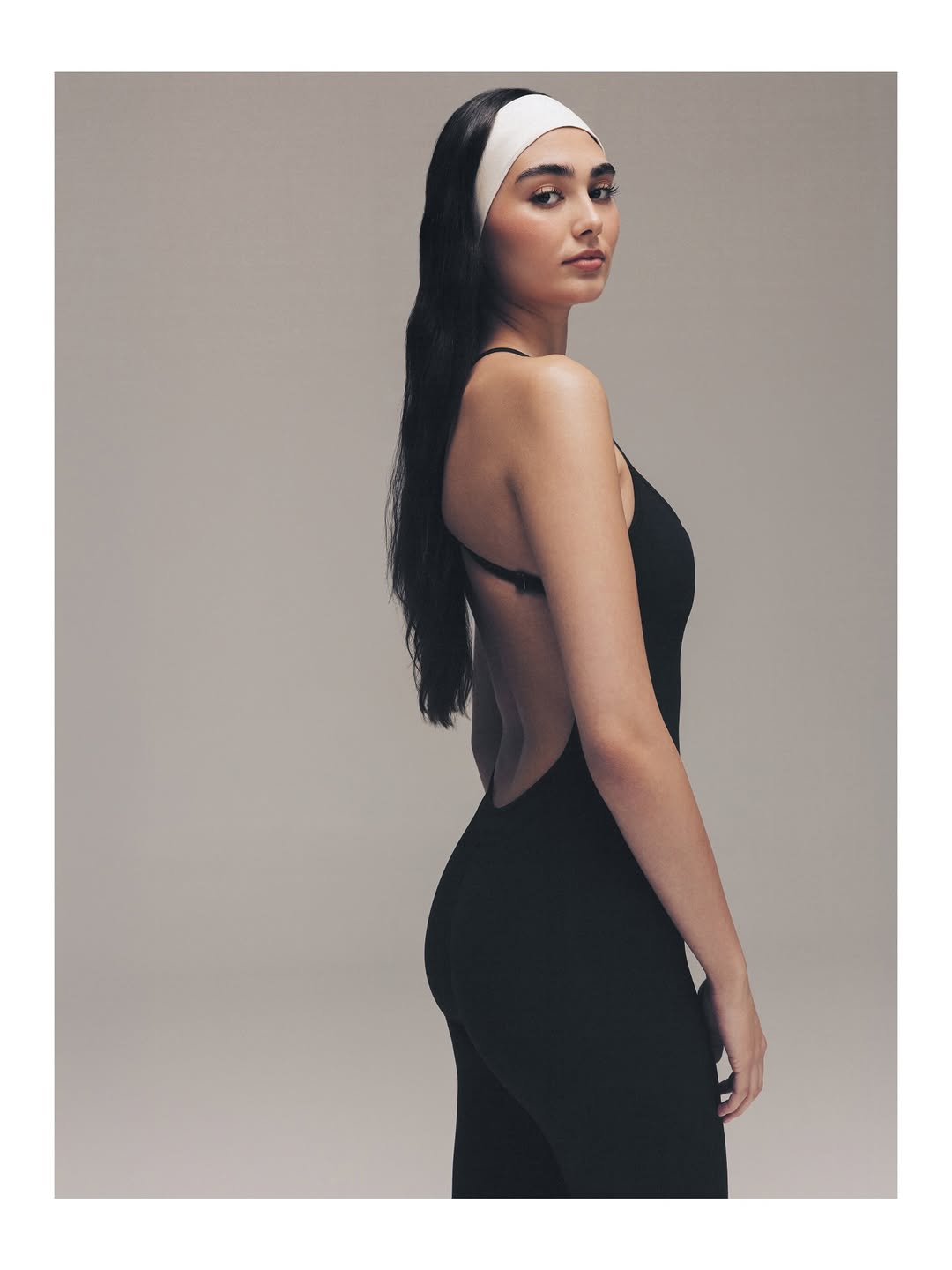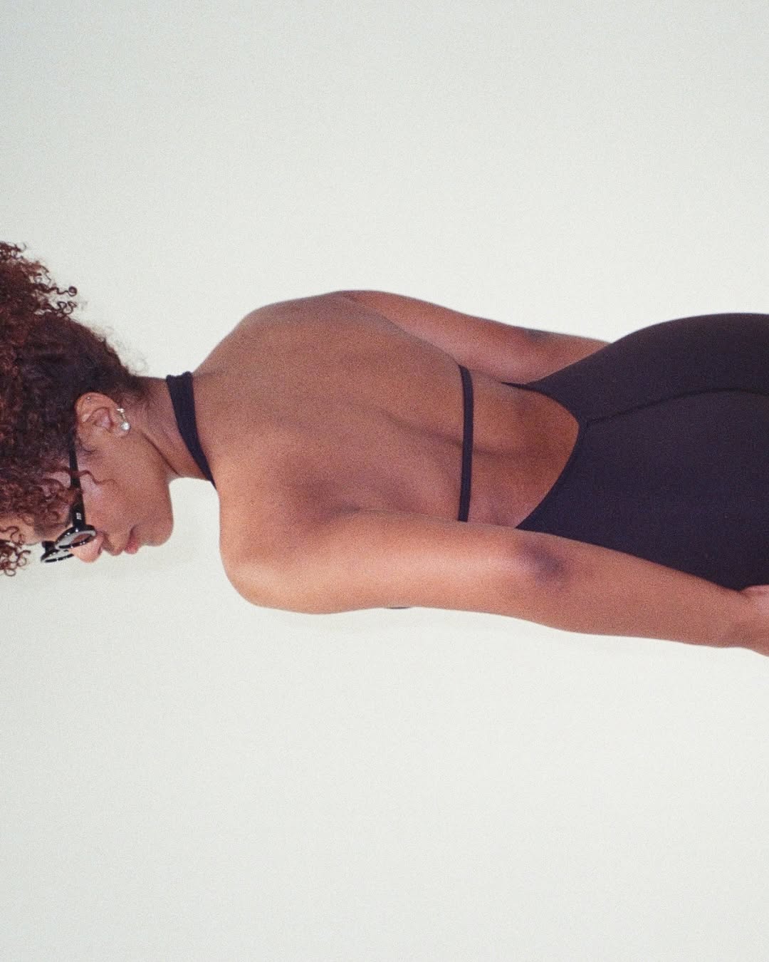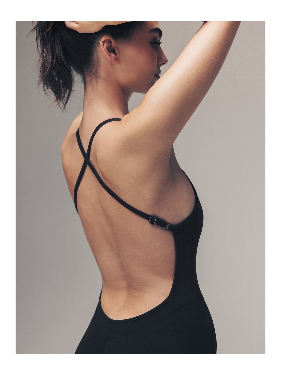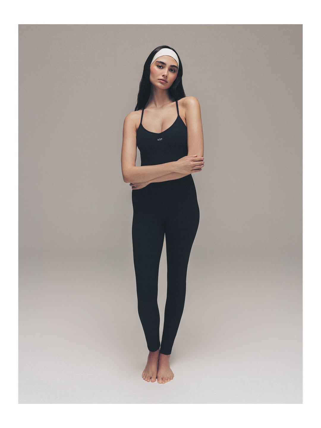 437 Activewear masters the art of curve-celebrating minimalism with The Bare Onesie ($115), a slim-leg marvel in 82% recycled polyester and 18% spandex that molds to every body like a second skin. Pull-on styling, padded cups, and princess seams sculpt a flattering waist, while the deep open back with crisscross straps injects feminine drama into its functional core—proving activewear can command attention from yoga flows to evening outings. In timeless black, it sidesteps saturation with impeccable fit that flatters all silhouettes, echoing the minimal strap renaissance blurring swim and ready-to-wear. Complement with The Curve Onesie ($82), drawing from the brand's 2-in-1 bra legacy via square neck front and scoop back for full-length poise. Machine washable and stretch-driven, these onesies embody 'less is more' luxury, transitioning effortlessly from poolside to power moves.