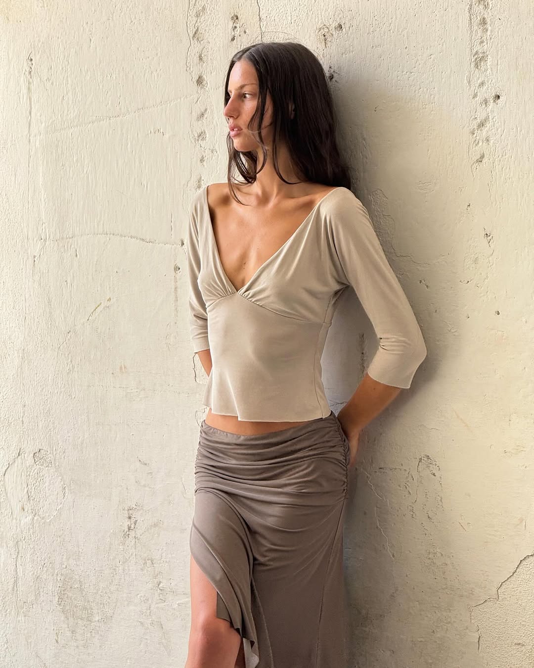 This top is a soft, creamy ivory. It's made from a smooth jersey fabric with a touch of stretch. The halter neckline and open back create a flattering, cropped silhouette. It's perfect for a night out or a special event. Pair it with high-waisted pants or a skirt. * Plunging neckline * Pull-on styling * Cropped length