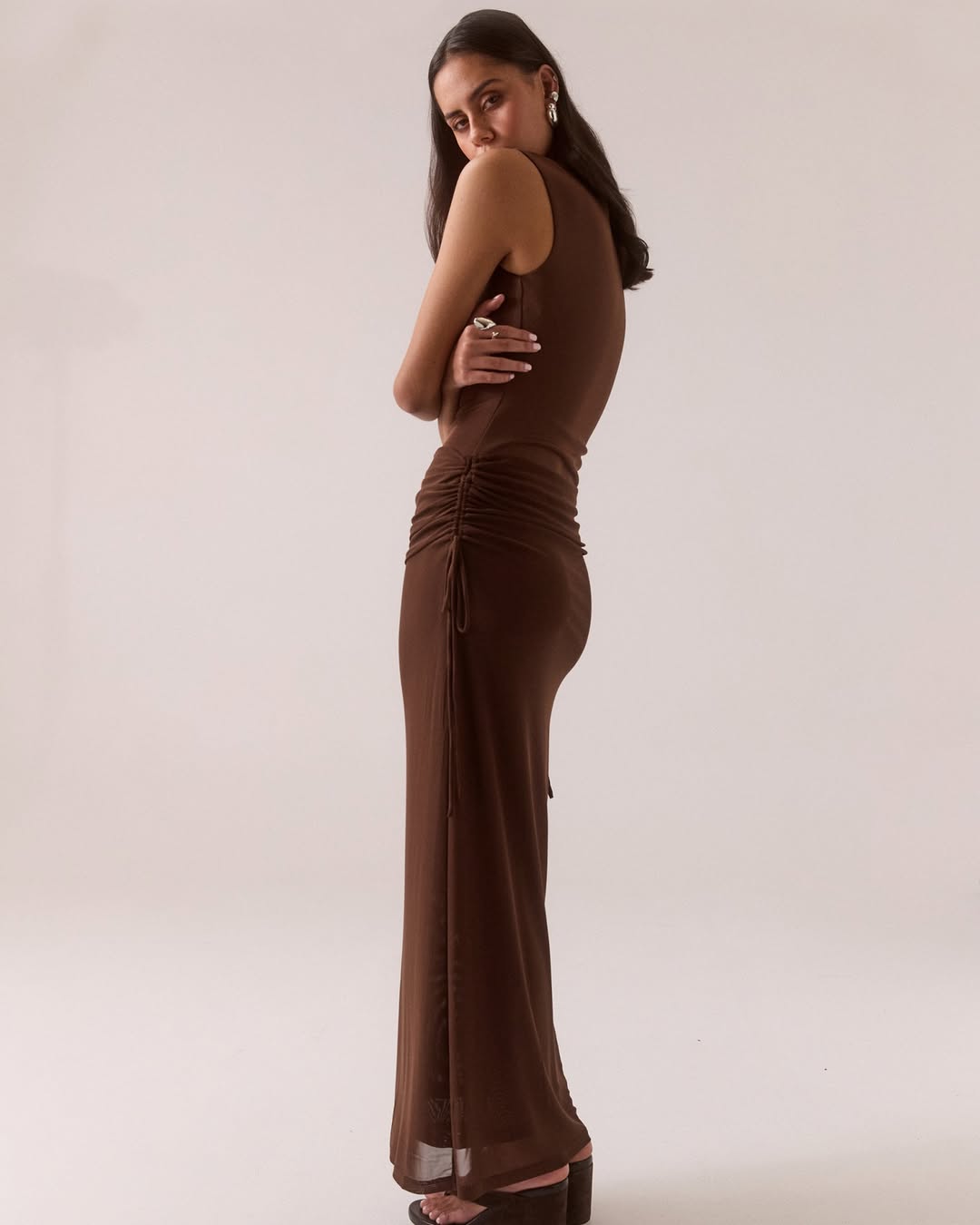 Brown midi dress with horizontal ruching and gathering at the waist and hips, side tie detail, tube-style bodice, fitted silhouette, side profile view on model with arched back pose