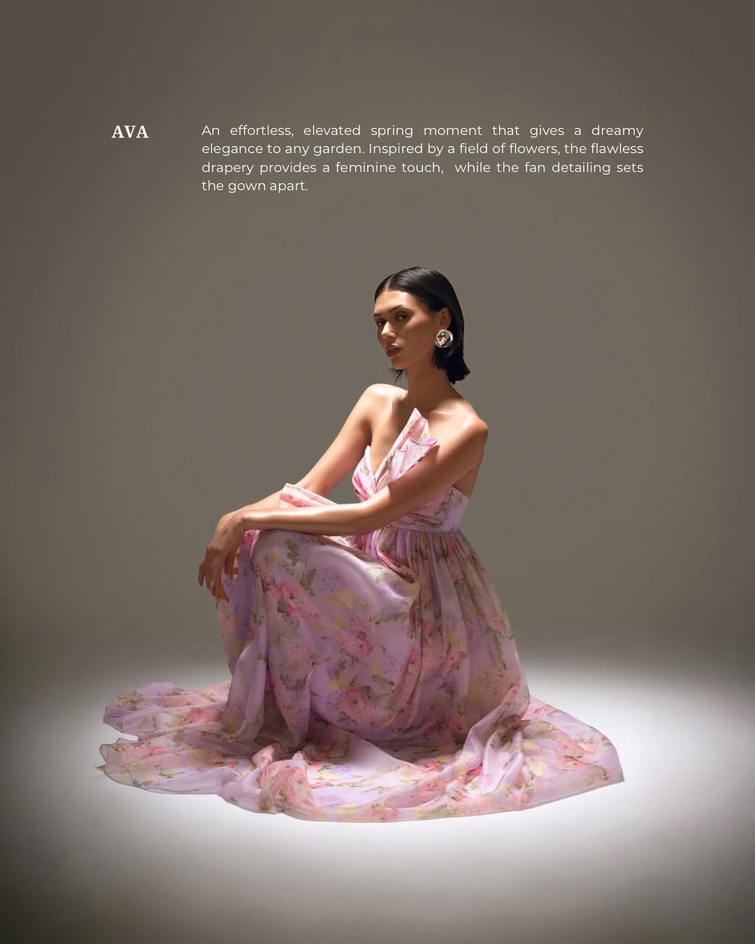 Katie May Collection: Founded in Los Angeles in 2010, Katie May Collection is known for statement eveningwear that balances sensual silhouettes with modern restraint. The brand specializes in fluid gowns, slip dresses, and corseted bodices rendered in satin, crepe, and floral prints, designed for nights that demand presence. Its aesthetic is defined by romantic minimalism, body-conscious drape, elevated femininity, and confident allure.