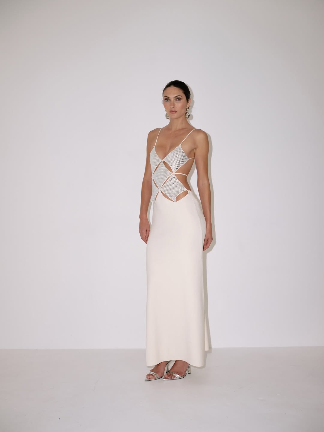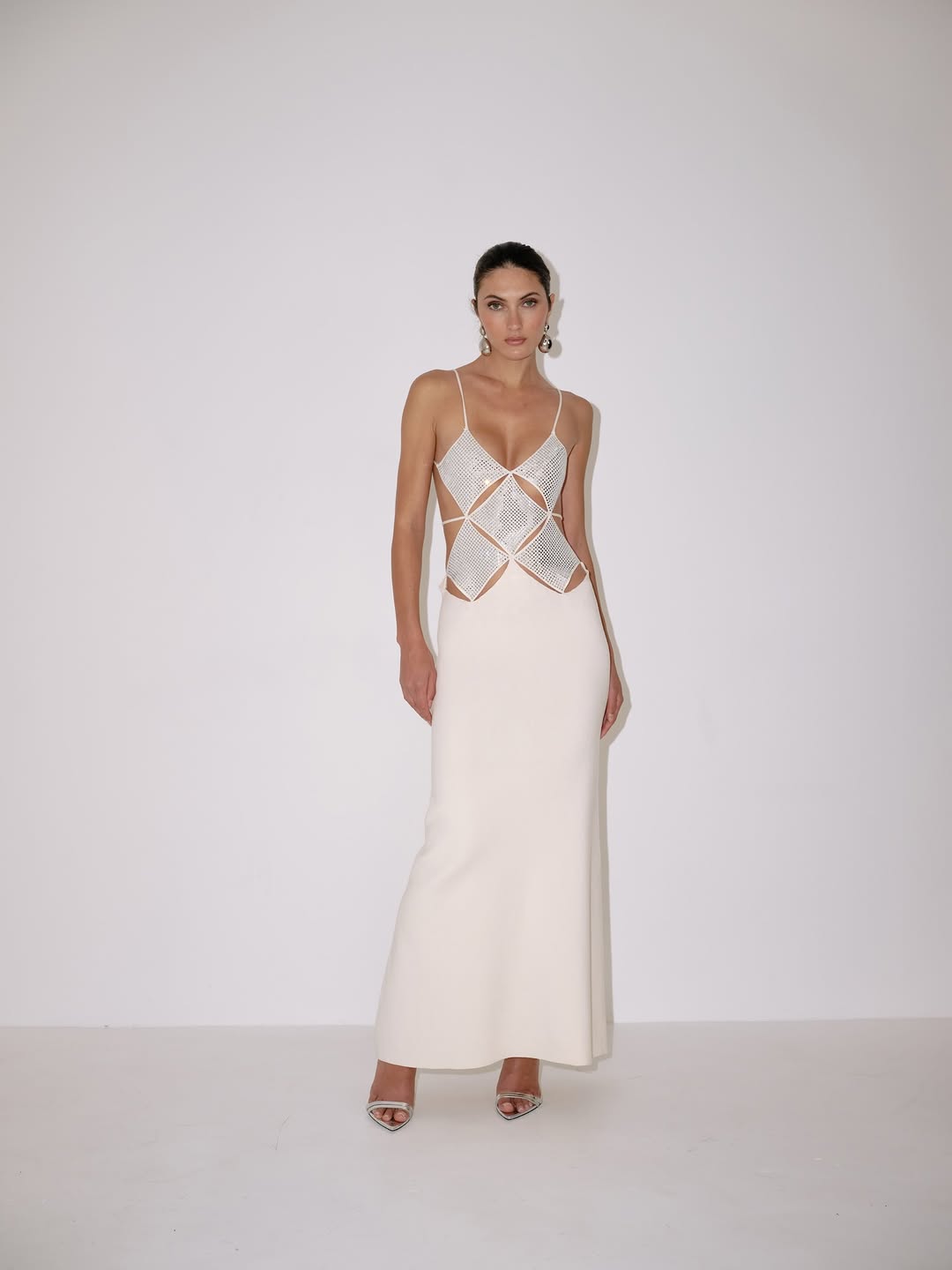 The ivory dress features a floor-length, A-line skirt. The bodice is constructed with a series of diamond-shaped cutouts, embellished with rhinestones, and connected by thin straps. The fabric appears to have a smooth, opaque texture.