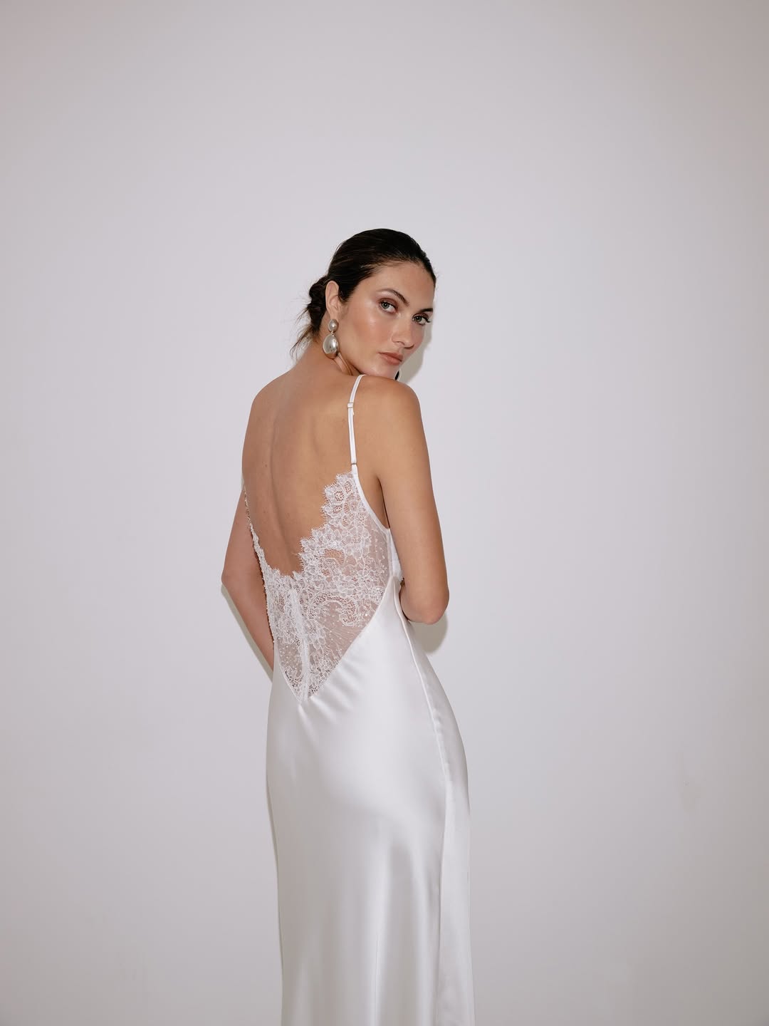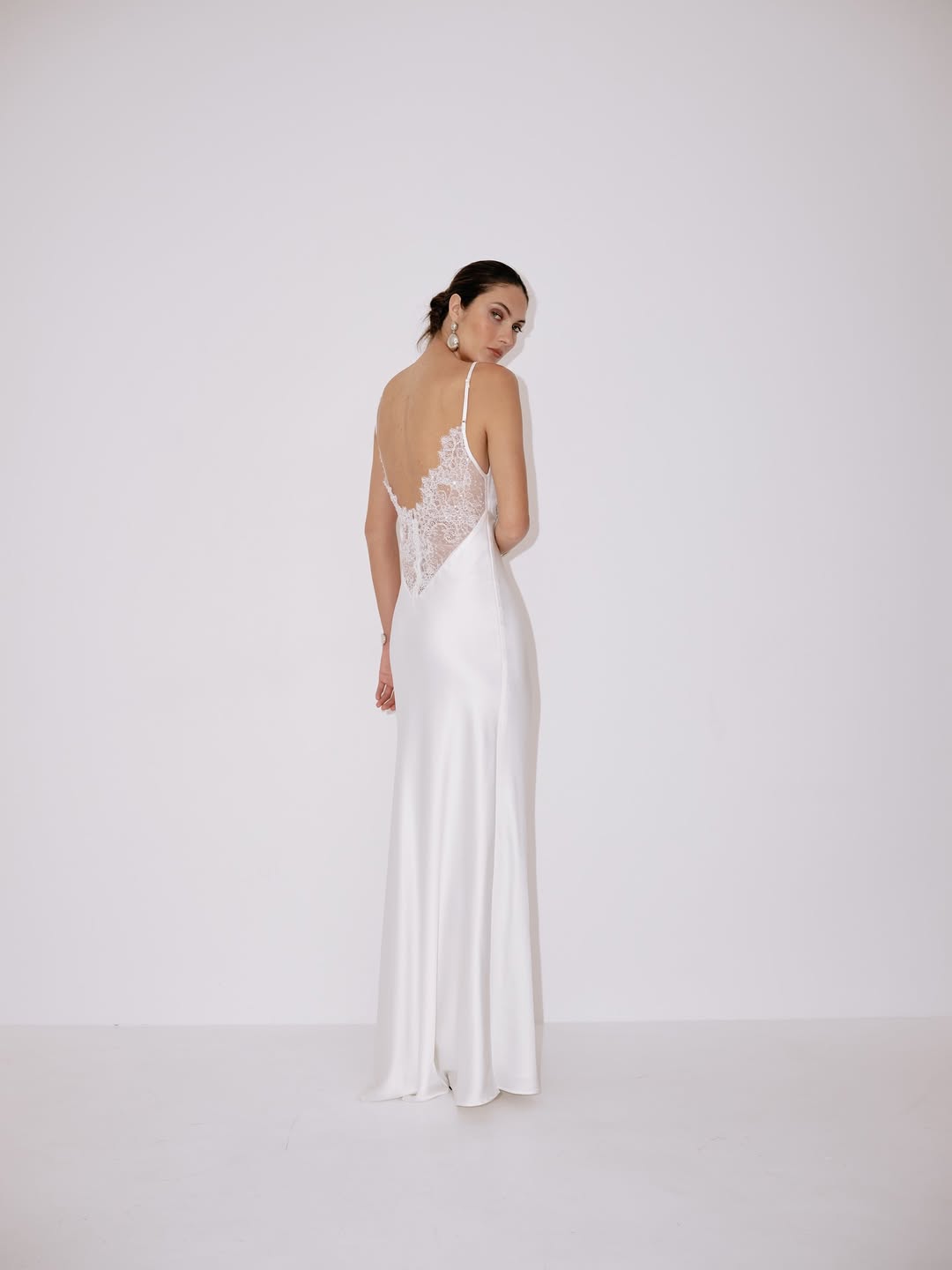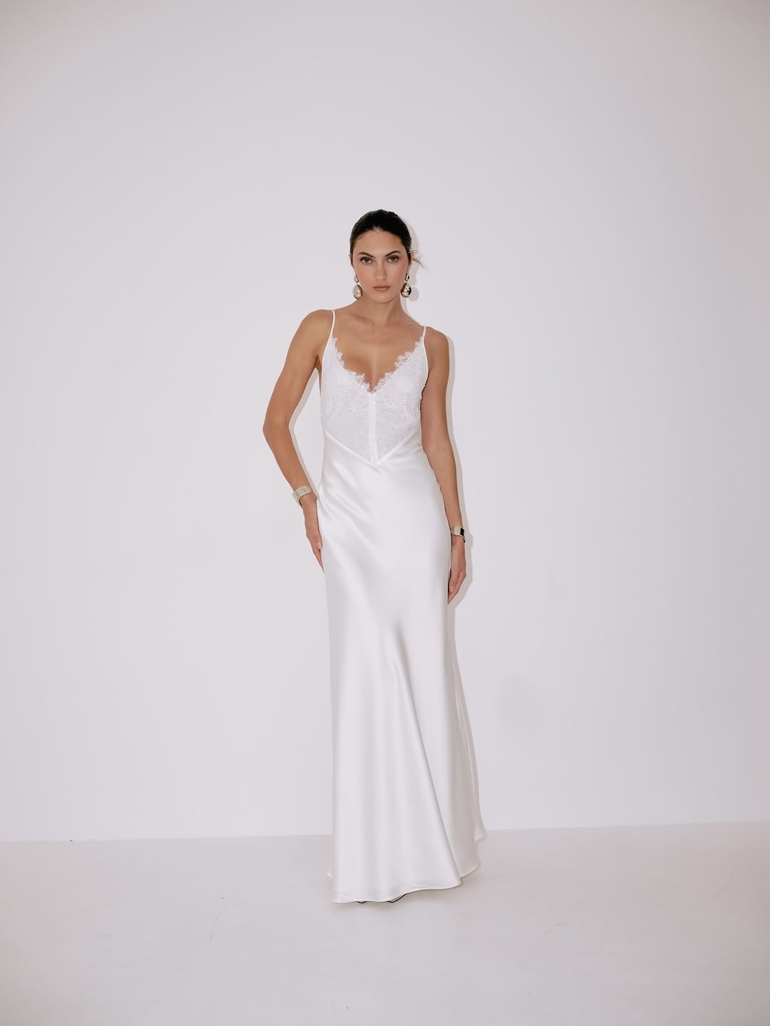 This elegant white strapless gown features a textured, embroidered bodice and a flowing, pleated skirt. The midweight gauze fabric feels light and airy, while the boned bodice offers a structured fit. A detachable scarf adds a chic finishing touch, making this a refined choice for formal events or a sophisticated bridal look. * Strapless neckline with embroidered bodice * Flowing pleated skirt * Includes detachable scarf accent * Hidden back zipper closure * 51" length from neckline to hem