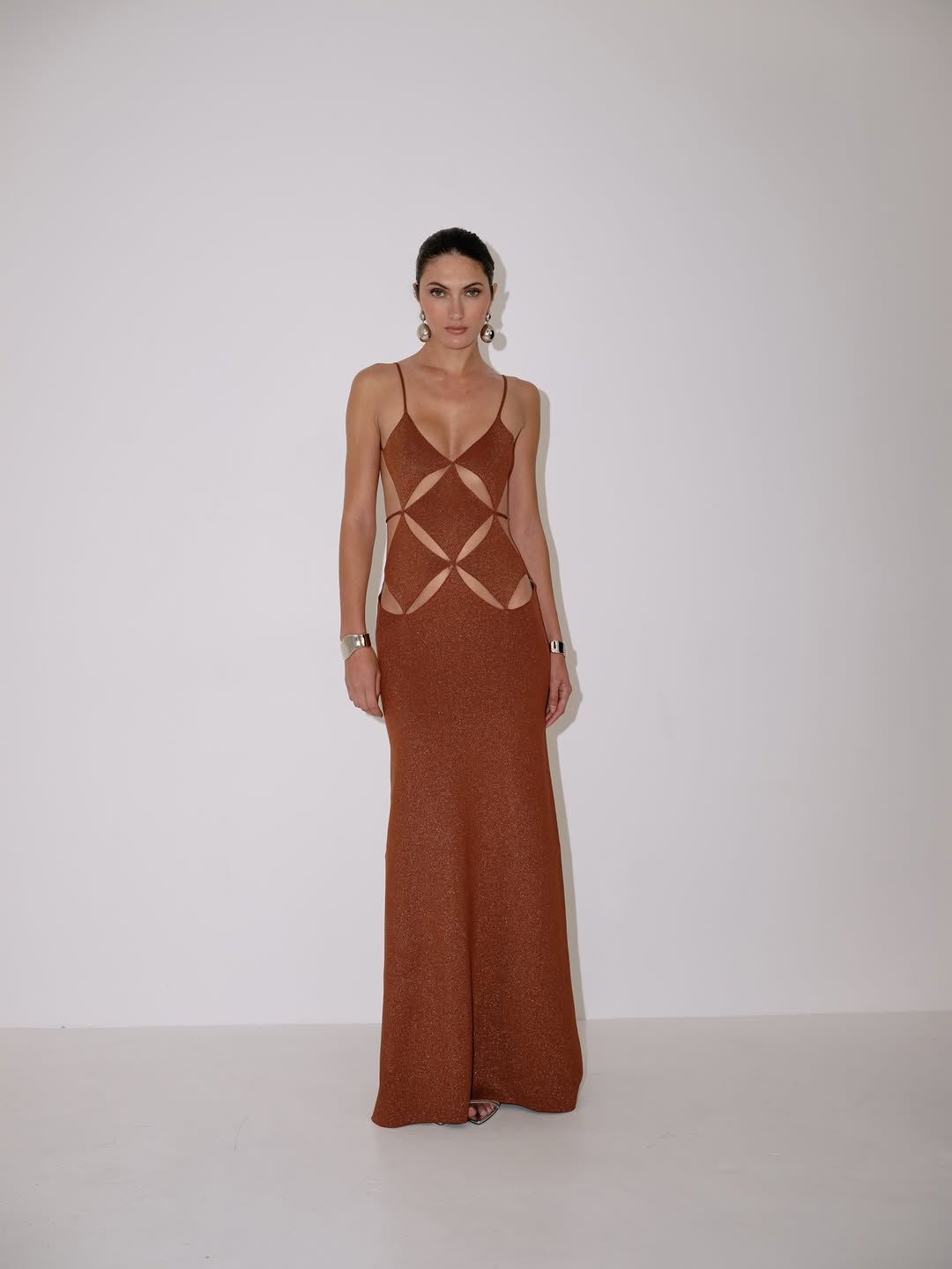 This maxi dress is a soft, shimmering seafoam green. It's made from a midweight knit with a subtle metallic thread. The dress features a sleek silhouette with cutouts and a back self-tie closure. * Maxi length * Cutout details * Back self-tie closure