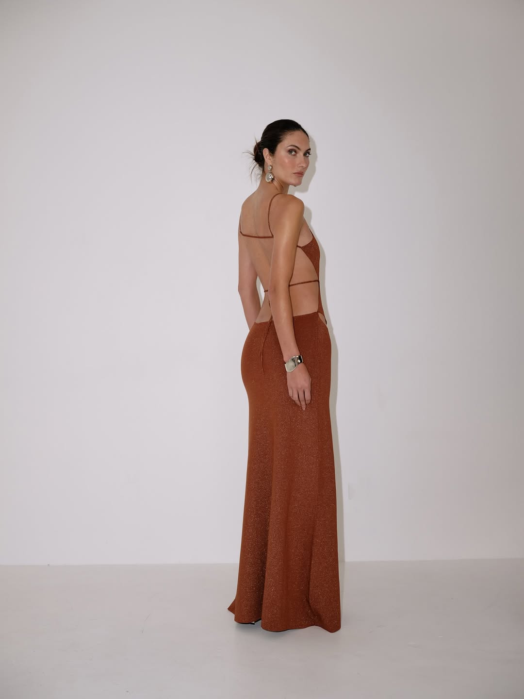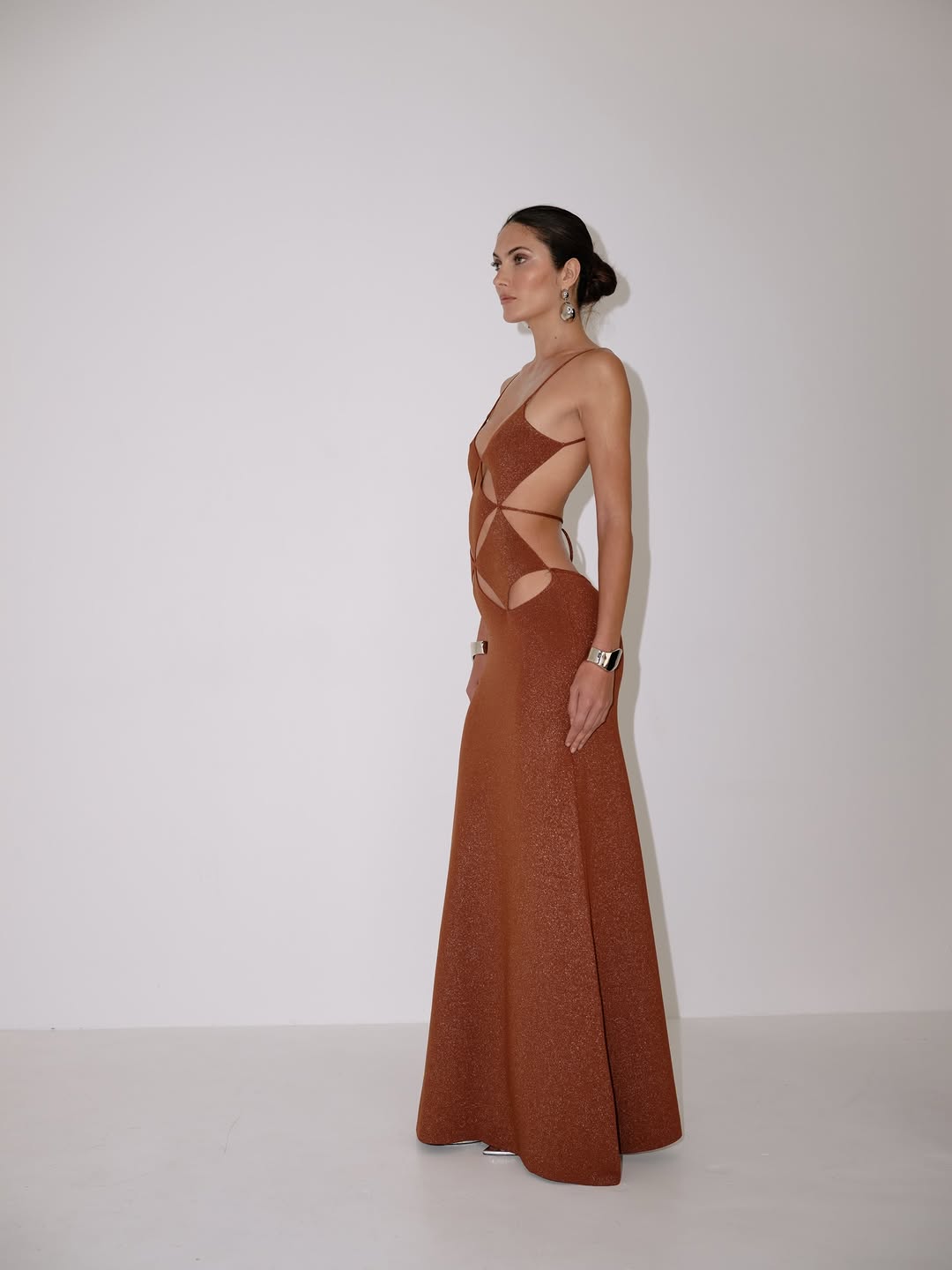 The ivory dress features a floor-length, A-line skirt. The bodice is constructed with a series of diamond-shaped cutouts, embellished with rhinestones, and connected by thin straps. The fabric appears to have a smooth, opaque texture.