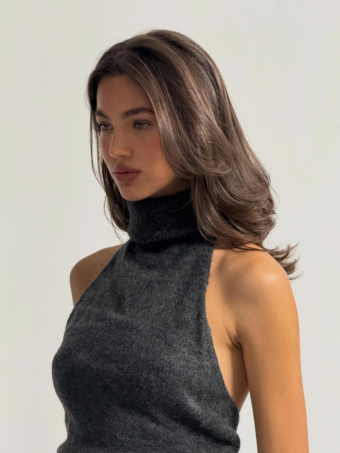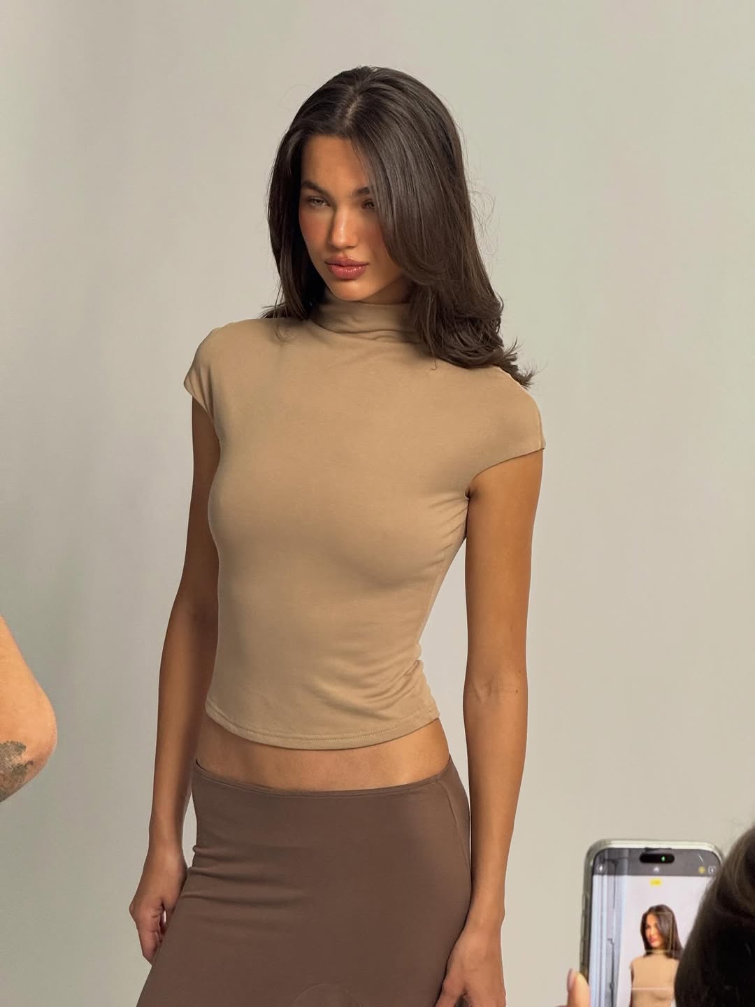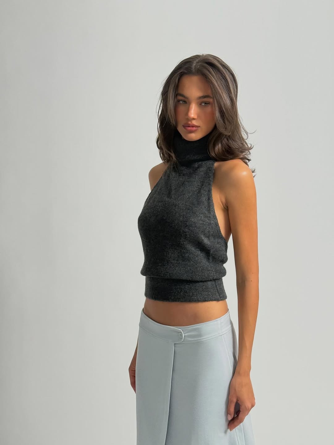 This top is a soft, creamy ivory. It's made from a smooth jersey fabric with a touch of stretch. The halter neckline and open back create a flattering, cropped silhouette. It's perfect for a night out or a special event. Pair it with high-waisted pants or a skirt. * Plunging neckline * Pull-on styling * Cropped length