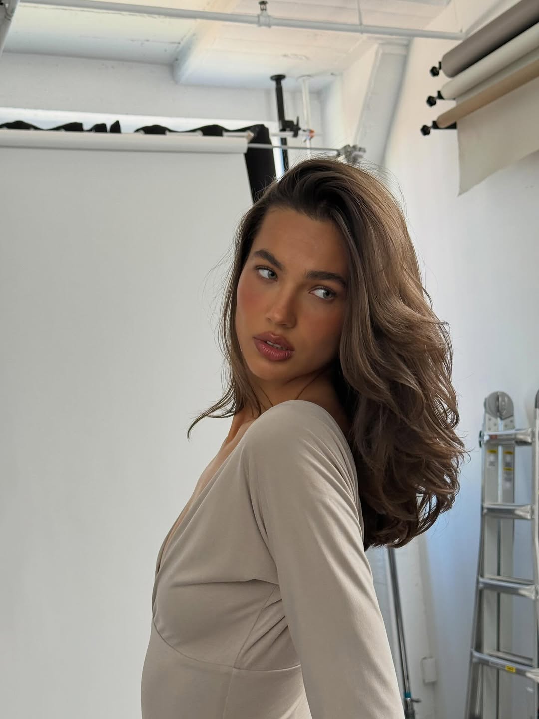 sultry, confident studio pose, behind-the-scenes fashion shoot