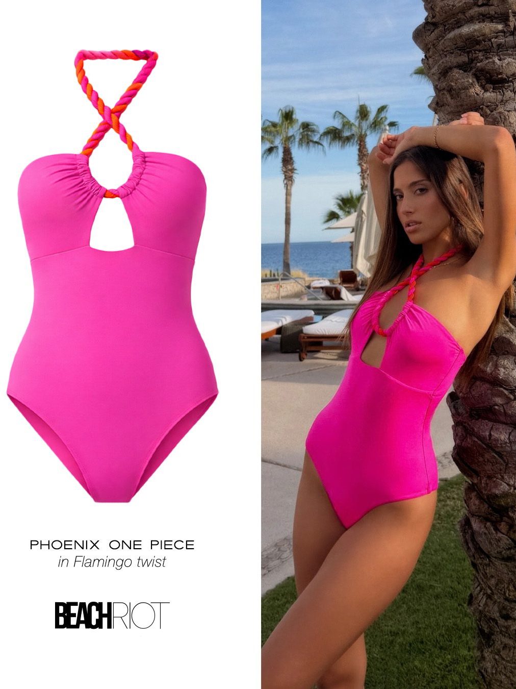 Beach Riot, the Los Angeles-born provocateur since 2014, fuses swimwear, activewear, and off-duty knits into a sun-kissed playbook of sporty femininity, California ease, and pop-color glamour. Inspired by hot nights with nowhere to be—twisted ropes, bold pinks, and that lingering warm air—their Phoenix One Pieces deliver seamless beach-to-bar transitions. The Flamingo Twist ($188) captivates in vibrant flamingo pink with a braided halter neckline, adjustable ties, and ruched bust for a flirtatious, body-skimming hug. Opt for the Malibu Pink ($178) in ribbed stretch fabric with crisscross halter and removable soft cups for supportive allure, or the Strawberry Moon Terry ($168) in plush 96% polyester-4% spandex terry cloth, featuring adjustable halter, cut-out details, and buttery comfort. The Joyce One Piece Fuchsia Red Neon Pink ($168) amps up ribbed colorblock drama. Soft, stretchy materials ensure confident, curve-loving fits that scream feel-good evenings under neon skies.