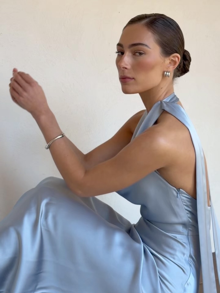 silvery-blue satin dress with asymmetric one-shoulder neckline, draped fabric panels and long ties, floor-length silhouette, hanging on wooden hanger