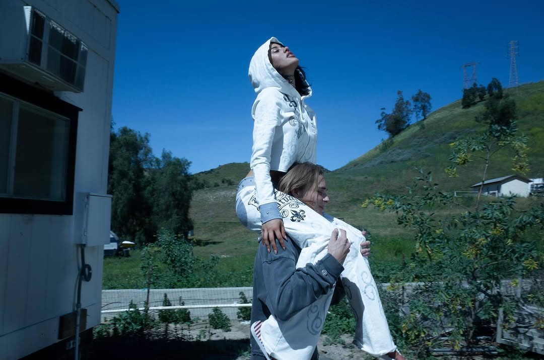 This sleeveless top features a scoop neck and a fitted silhouette. The fabric appears to be a midweight knit with a smooth texture. Embellishments include a beaded logo and bandana print trim along the neckline and armholes.