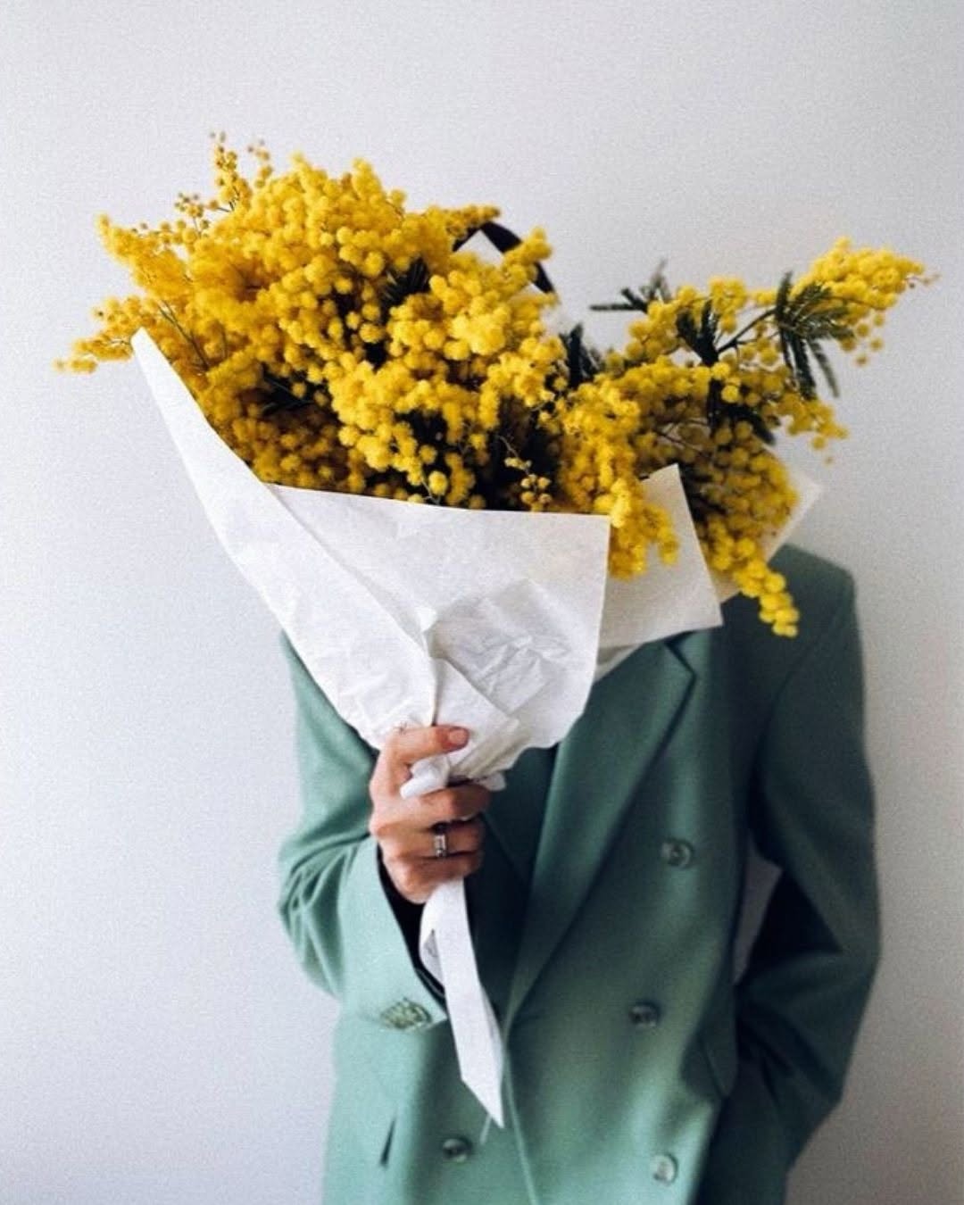sage green double-breasted blazer with notched lapels, structured shoulders, worn open, visible from shoulders up