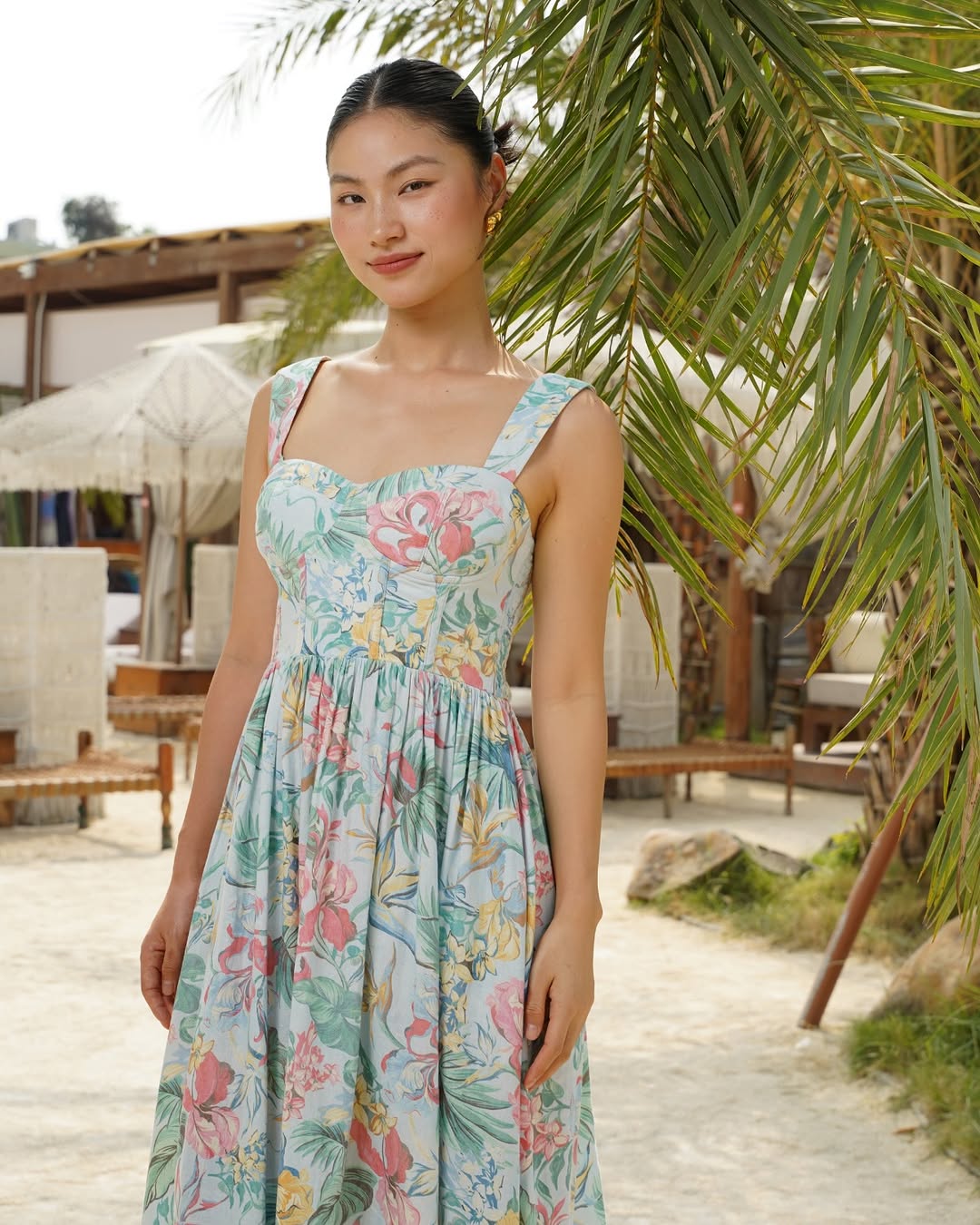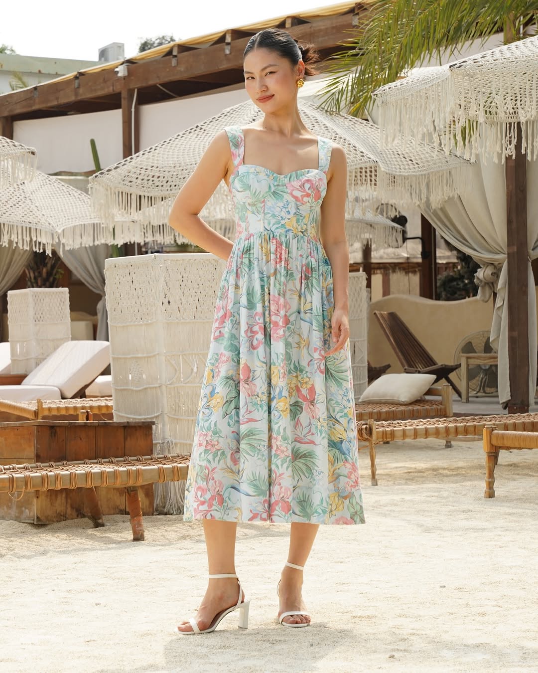 Capture a moment of pure romance in the SHAUNA DRESS, featuring a beautifully structured, bustier-style bodice and a soft sweetheart neckline. This midi-length silhouette is crafted from 100% linen and adorned with a vibrant floral print. The gracefully flared A-line skirt offers a timeless feminine aesthetic that feels both effortless and sophisticated.