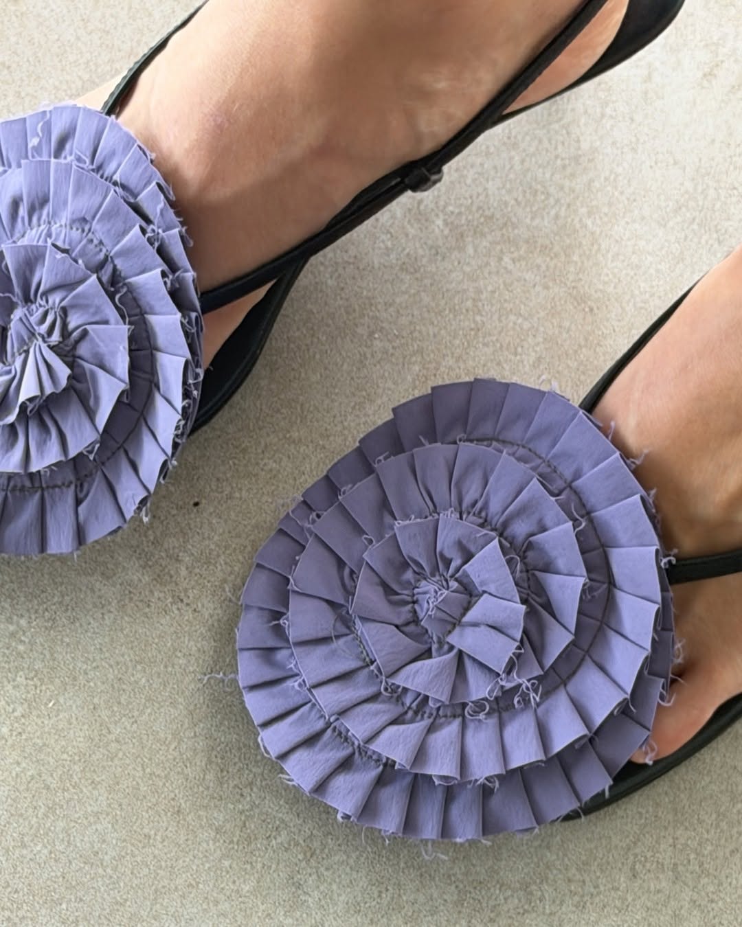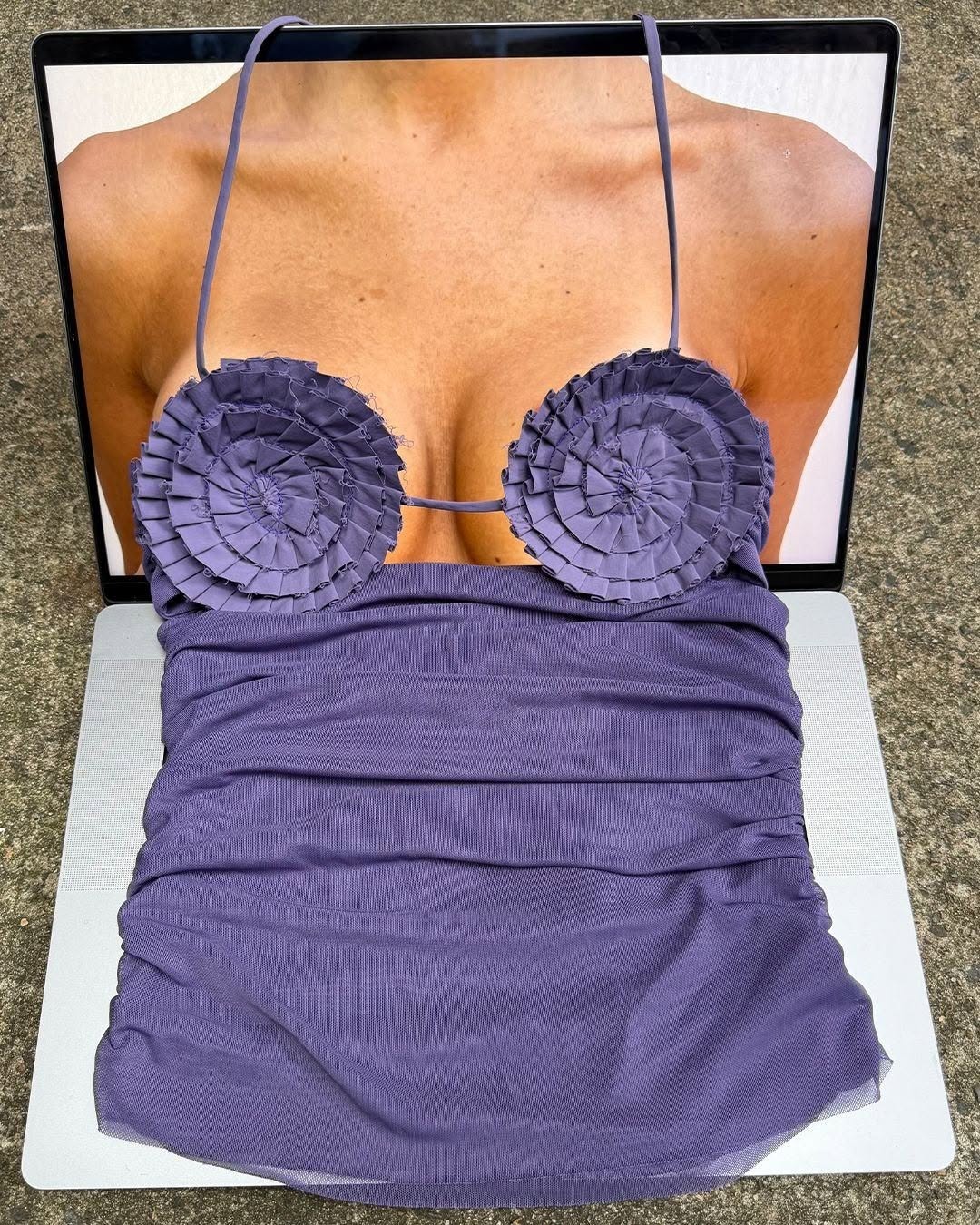 Purple chiffon ruched draped body with ruffled circular cups, thin spaghetti straps, halter neck style