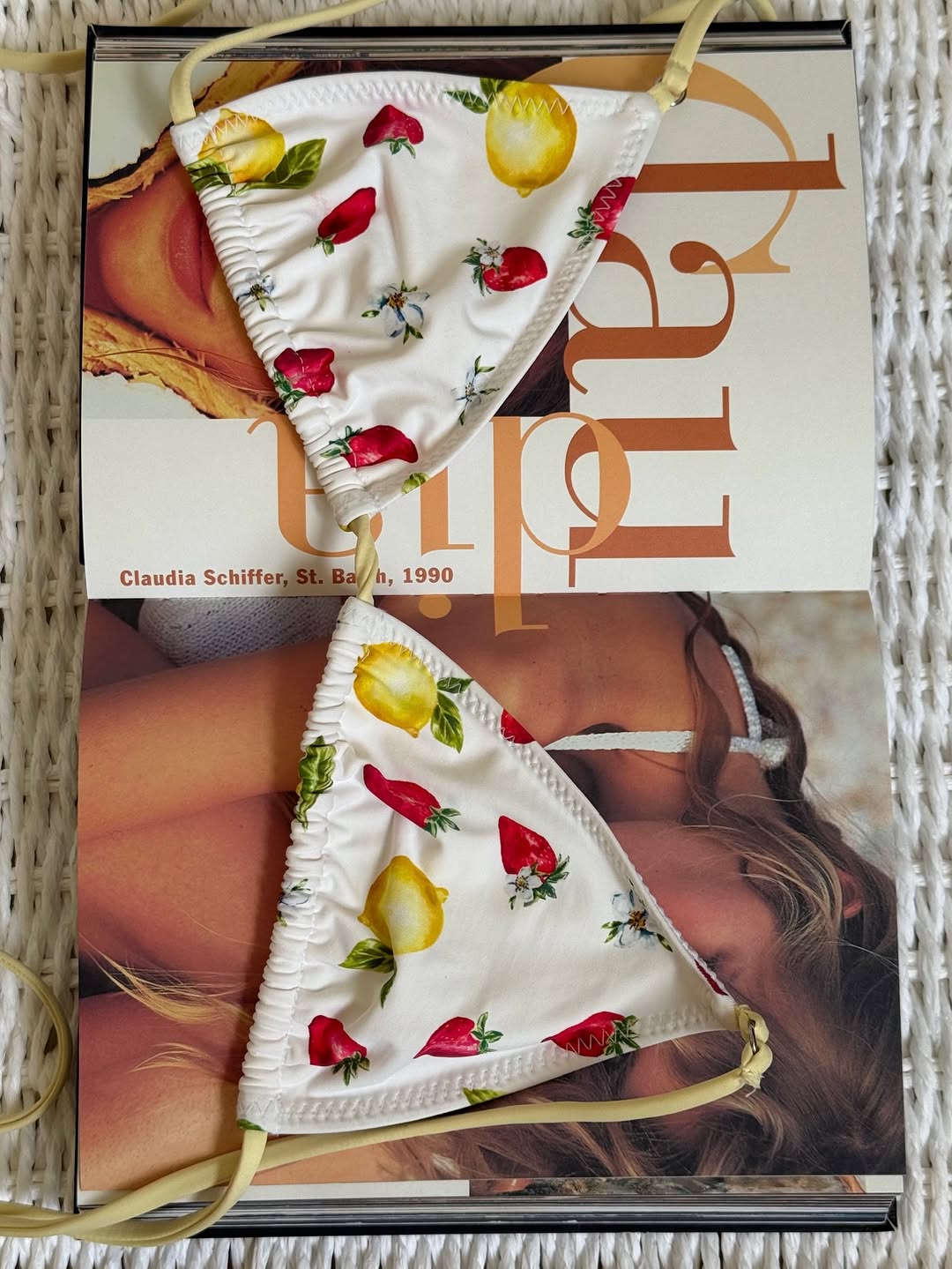 Triangle bikini top made of white fabric printed with scattered red strawberries and yellow lemons, featuring thin yellow straps tied in bows