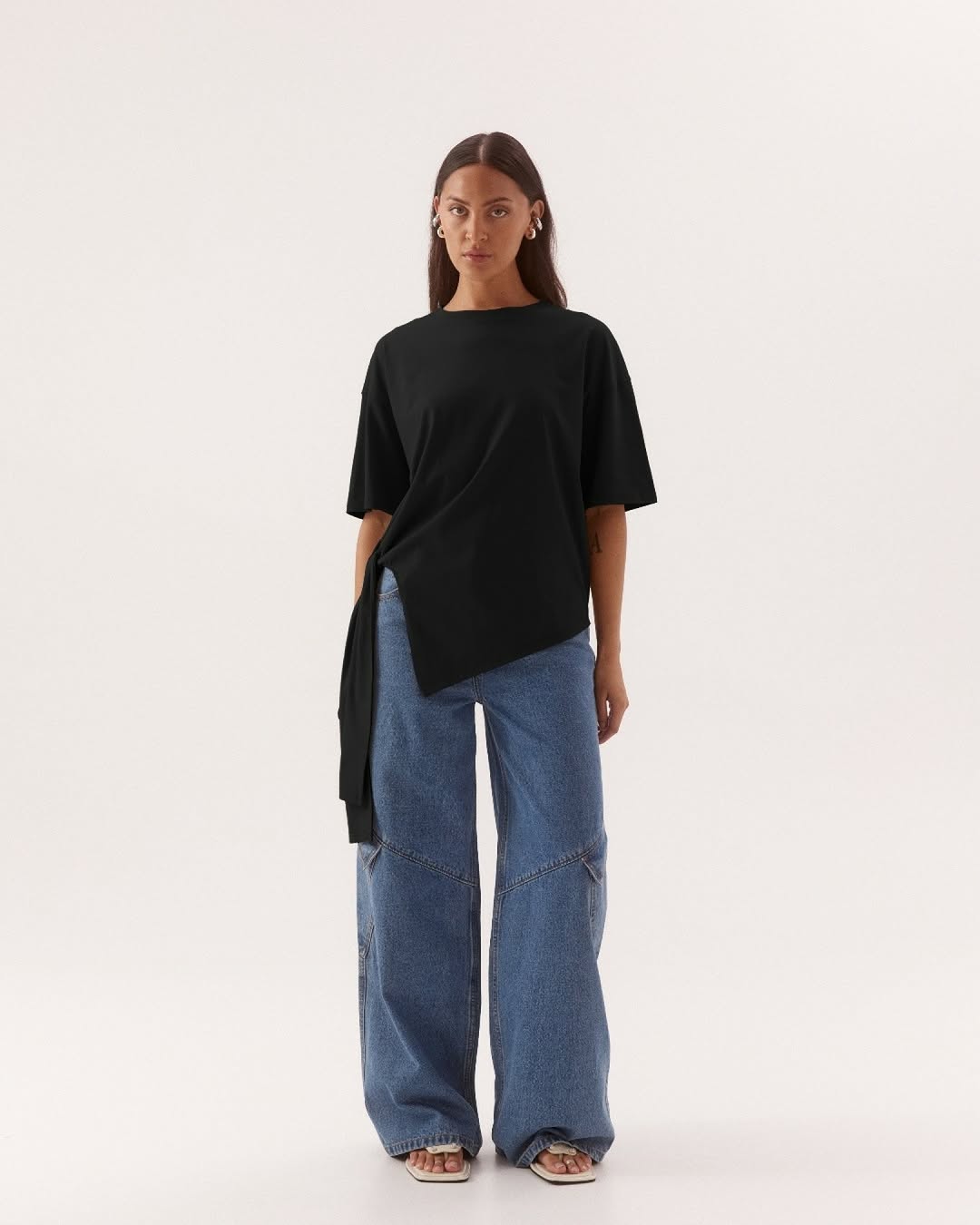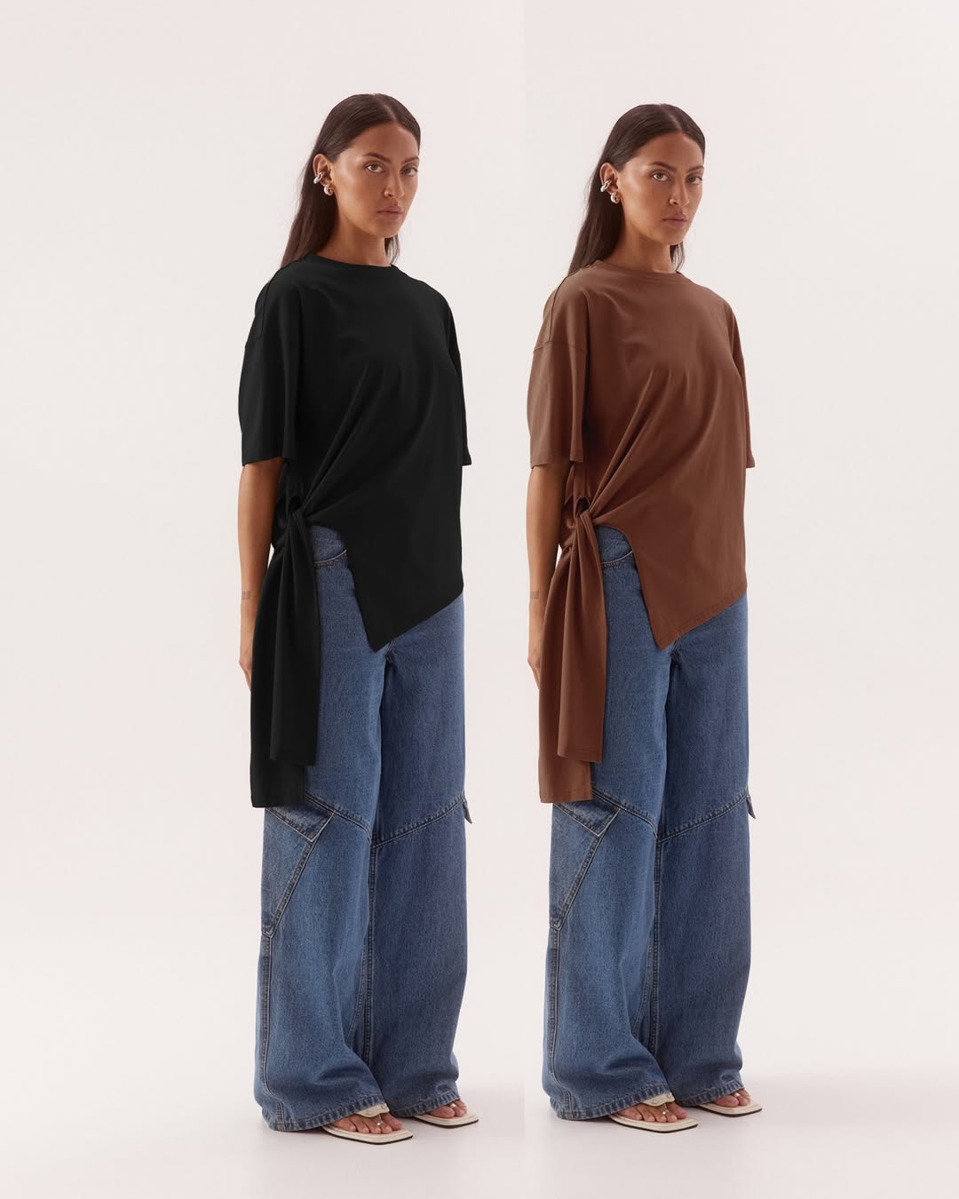 Short-sleeve crewneck tee in chocolate brown fabric with asymmetric side tie-wrap detail that drapes down the hip, oversized fit, versatile style
