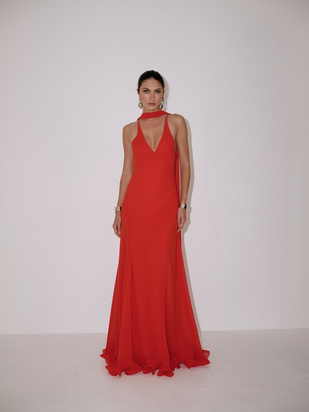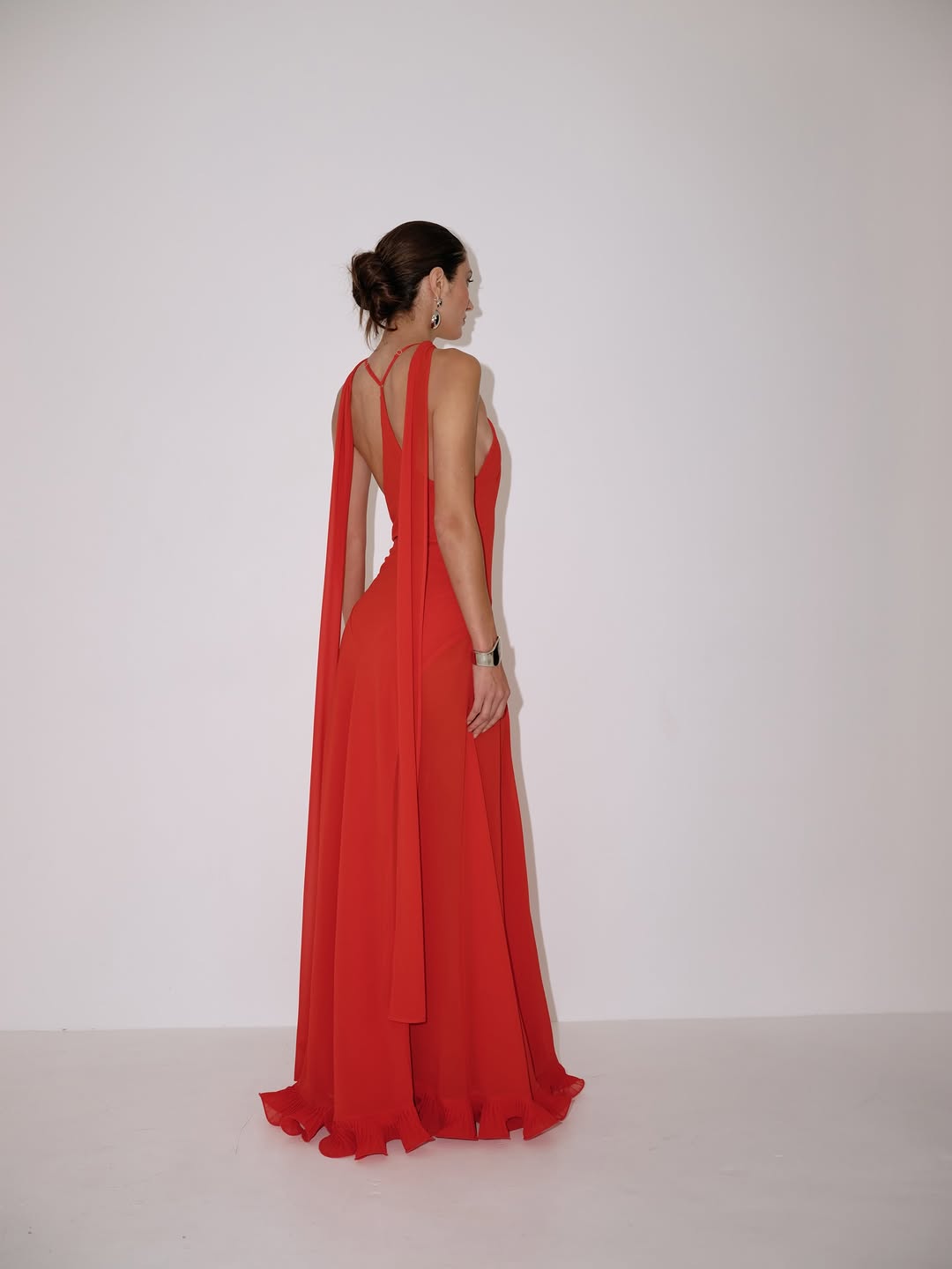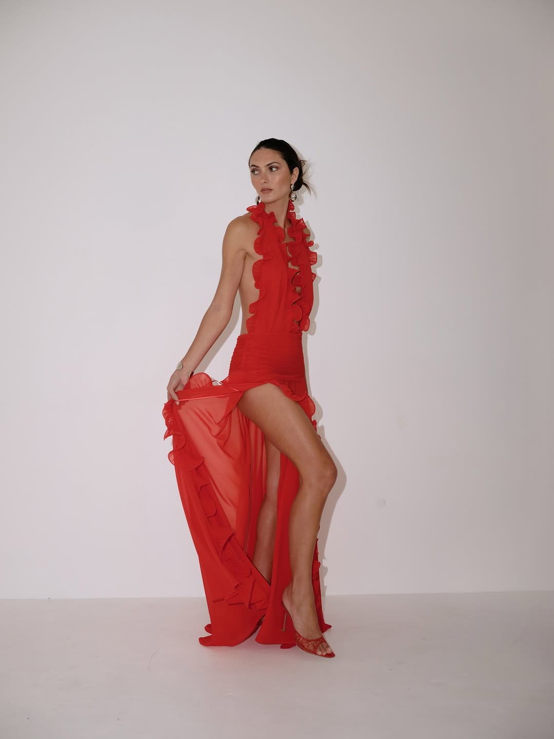 Sheer red chiffon floor-length gown with extensive ruffled frills around halter neckline, thin spaghetti straps, deep plunging neckline, cut-out sides, high side slits revealing legs, ruffled hem and train, named Ariella Dress