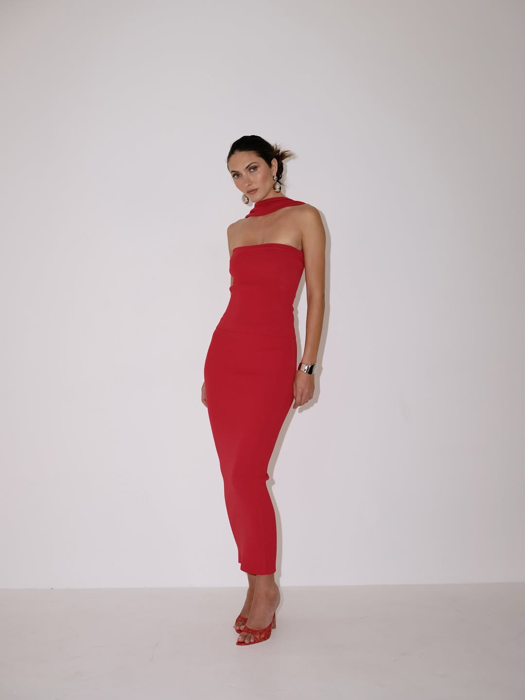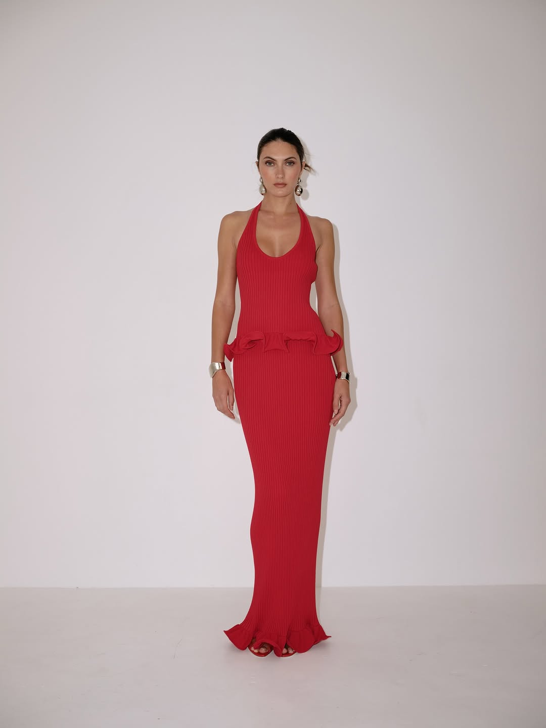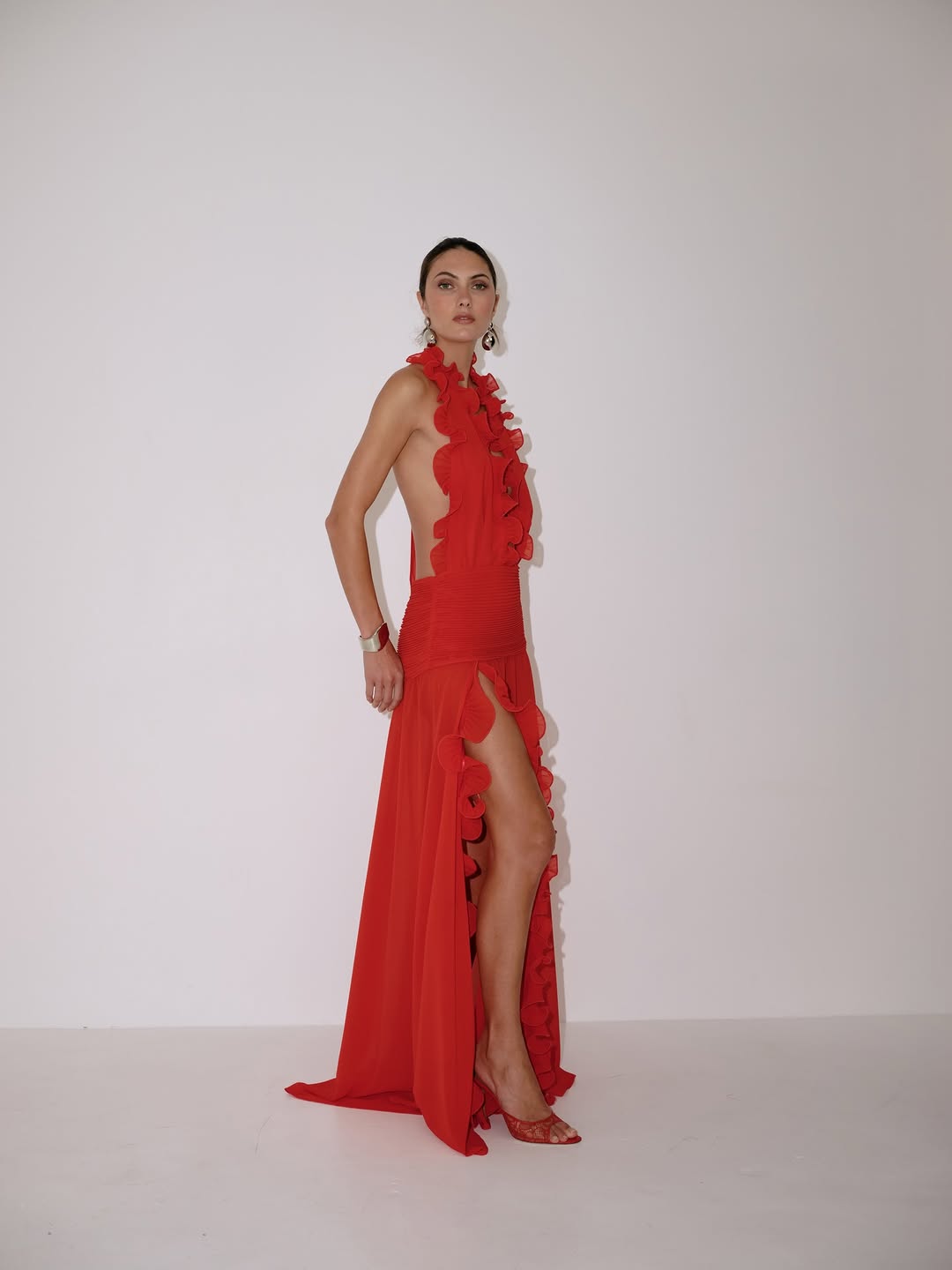This is a red maxi dress constructed from a lightweight, semi-sheer woven fabric. It features a halter neckline with cascading ruffles and a high slit on one side, also trimmed with ruffles.