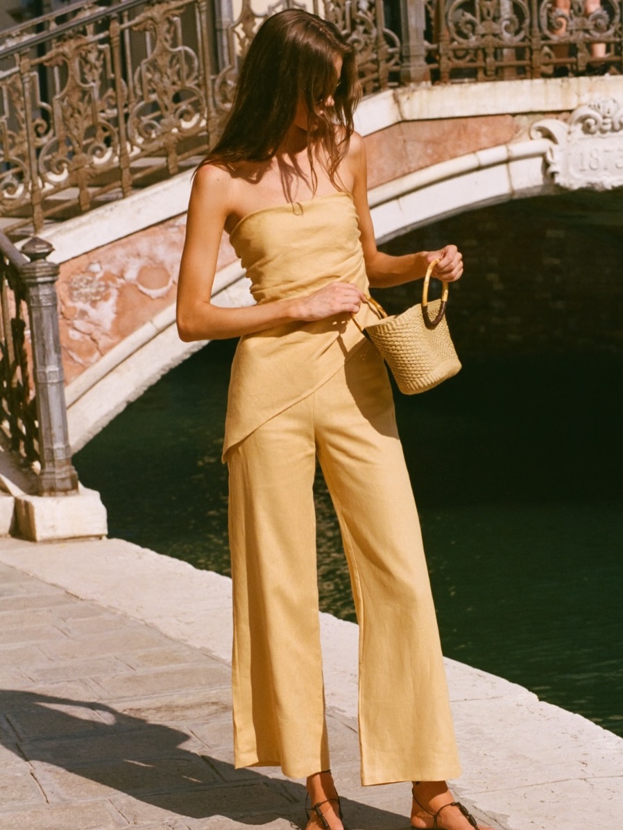 Faithfull the Brand, the Bali-born maestro of effortless resortwear since 2014, continues to enchant with its artisanal Indonesian roots and sun-washed femininity—think breathable European Flax linen that drapes like a perpetual vacation. Their beloved linen sets evolve into elevated silhouettes and faded hues, ideal for those seamless beach-to-city jaunts. Crafted from 100% linen with machine-wash ease, the Nera Top ($180) delivers an asymmetric hem and side-zip asymmetry for understated drama, while the Biba Halter Top ($230) ties at the back with a beaded neck accent, offering halterneck allure that's both relaxed and refined. Bandeau lovers, meet the cropped La Loza Top in Eggshell ($123) or the buttery x REVOLVE Antibes Strapless Top ($53), both in lightweight weaves with straight necklines and handkerchief hems for breezy, body-skimming fit. These pieces embody vacation-minded ease, with considered details that whisper nostalgic tailoring—perfect for sun-drenched days or twilight aperitifs.