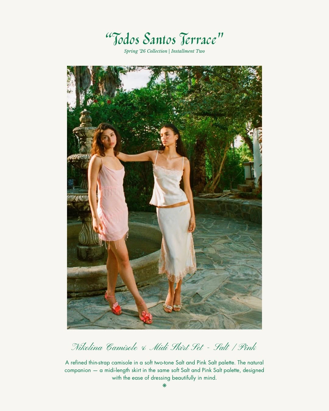 NIKOLINA Camisole & Midi Skirt Set — Salt & Pink. ✽ Soft as an afternoon in the sun, the NIKOLINA set pairs a delicate lace-trim camisole with a fluid midi skirt — effortless dressing for wherever the season takes you. Shop the “Todos Santos Terrace” collection online & in boutiques now. #ASTARESORT