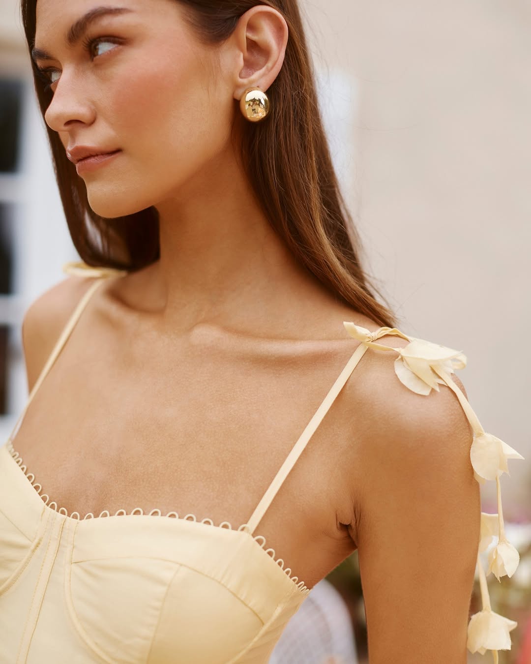 Pale yellow midi dress with thin spaghetti straps featuring knotted bow details, structured corset-style bustier bodice with boning, full skirt with tiered ruffle hem