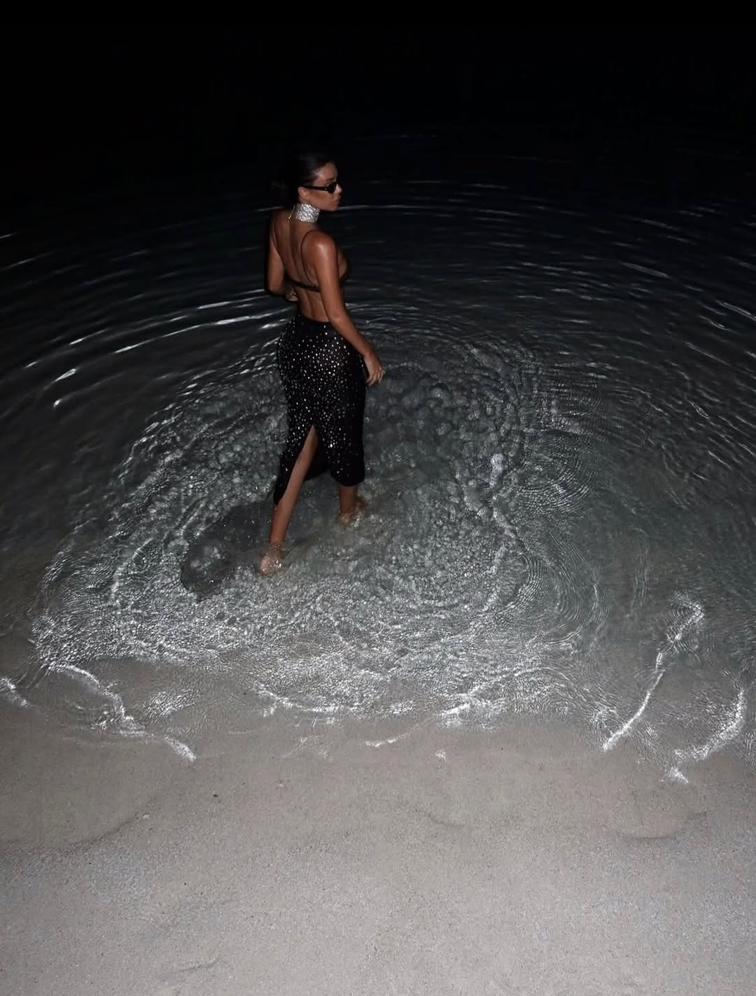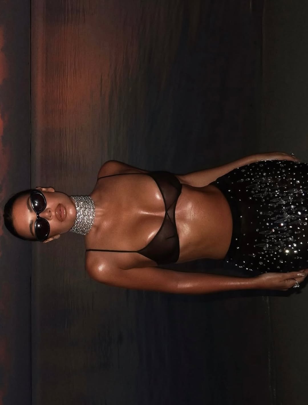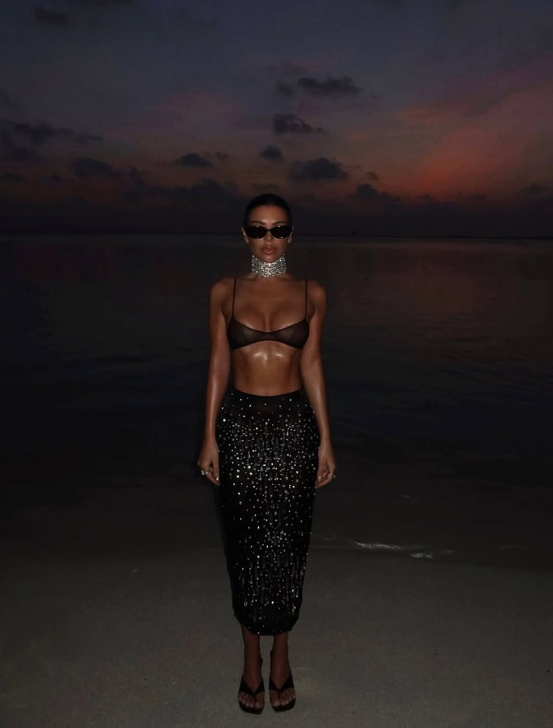 The midi-length skirt is constructed from a sheer, black fabric and features a center front slit. Scattered embellishments of white beads and clear crystals adorn the skirt. The silhouette is a straight fit.