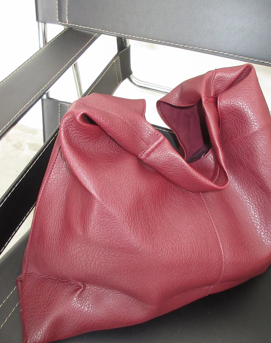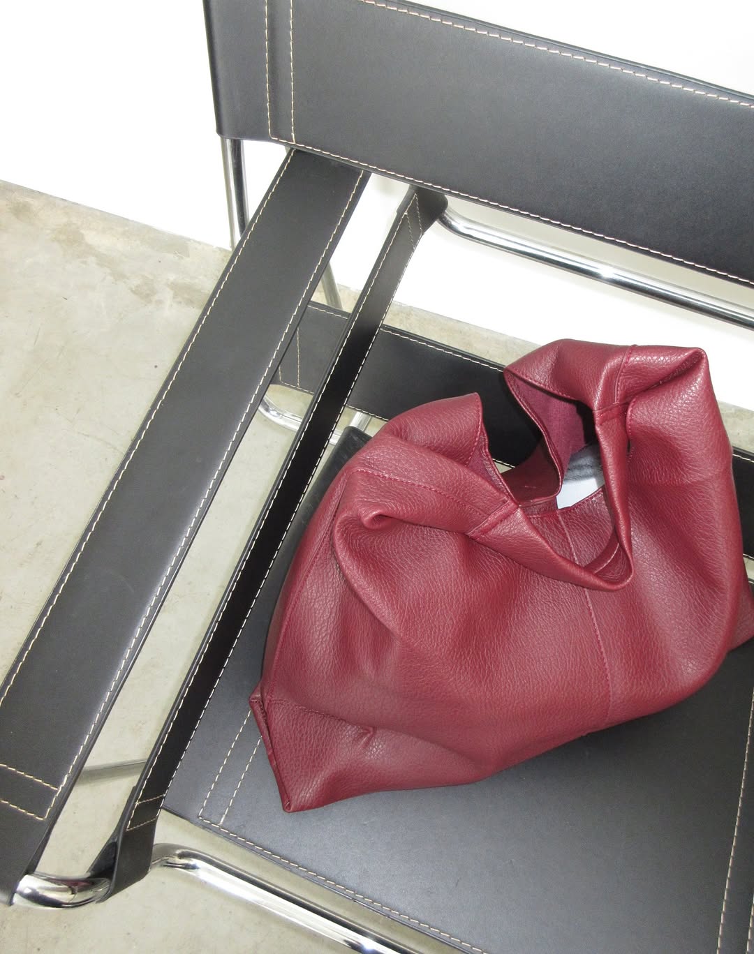 Slouchy burgundy pebbled leather tote bag with soft unstructured shape, two twisted top handles, placed draped on chair seat