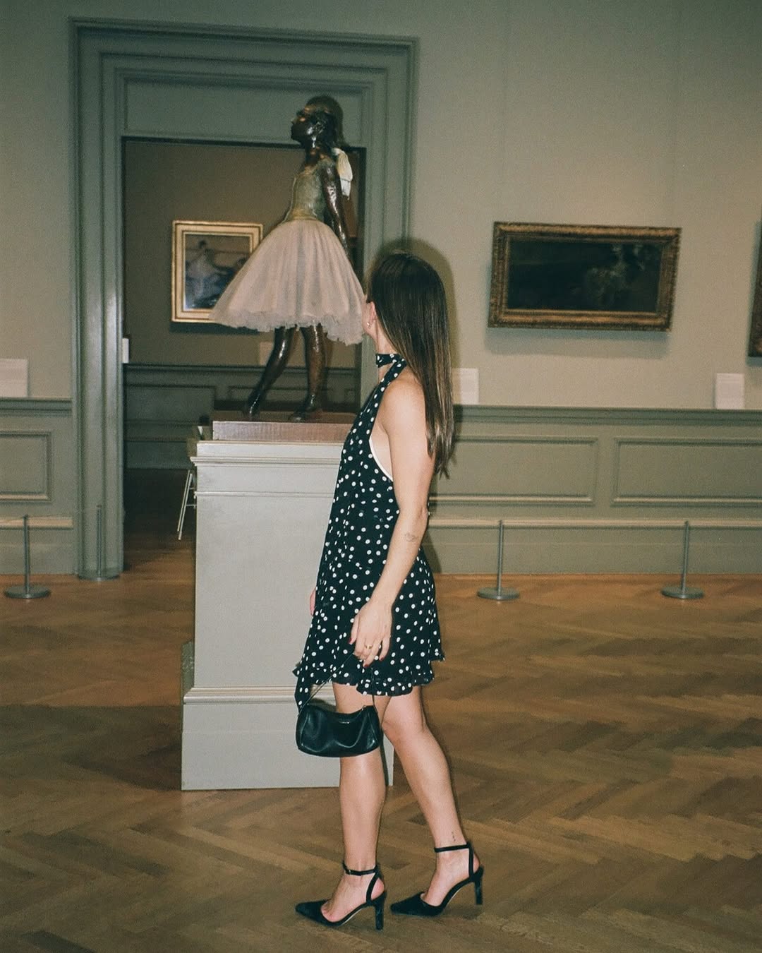 sleeveless black mini dress with white polka dots, deep V-neckline, wrap-style front with tie detail, fitted bodice, flared skirt ending mid-thigh